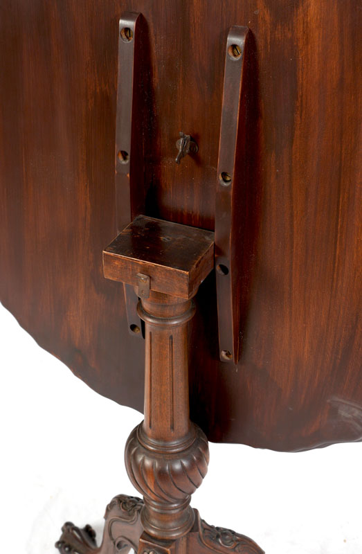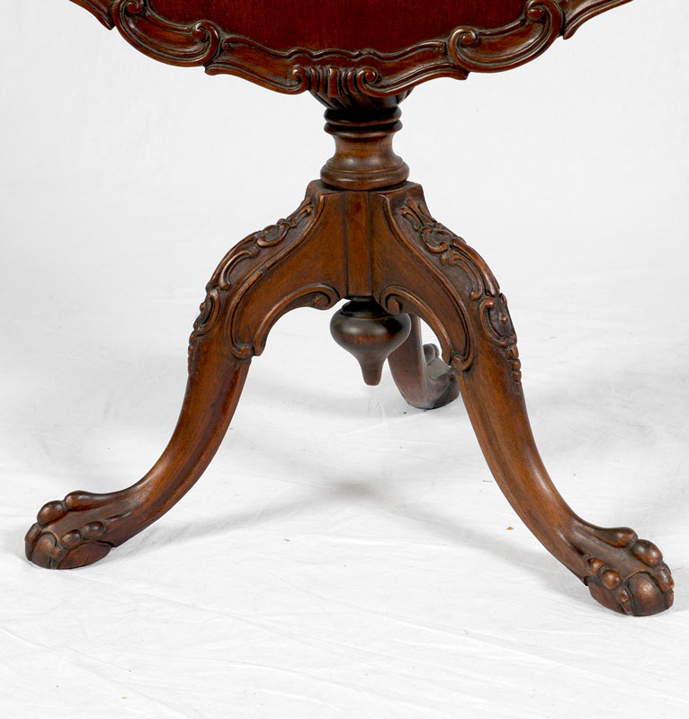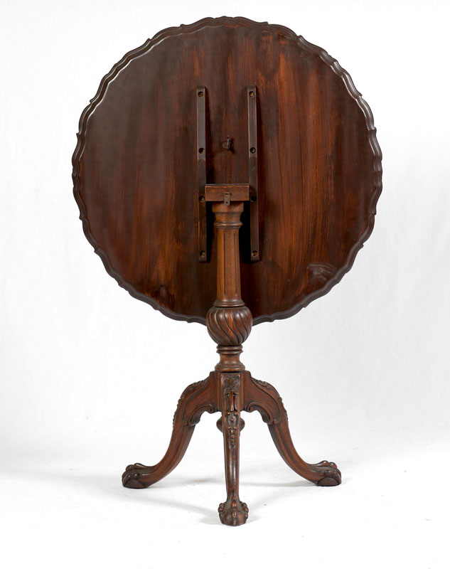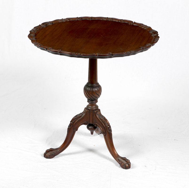 PIE CRUST TILT TOP TABLE: Early 20th century mahogany tilt top table, carved pie crust trim, turned columns, 3 carved splayed legs ending in claw and ball feet, 30'' h. x 28 3/4''.