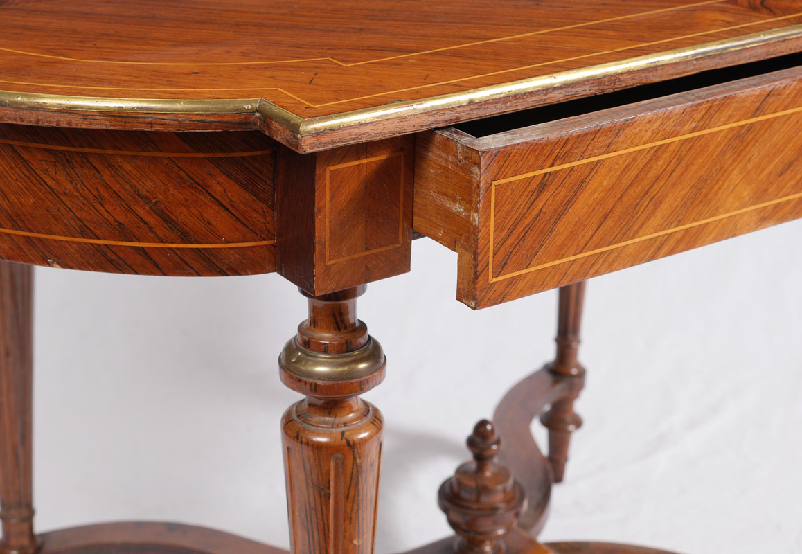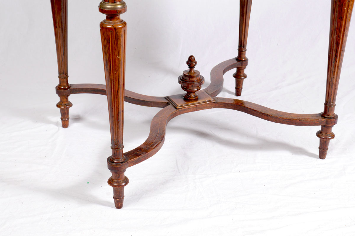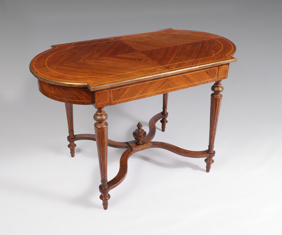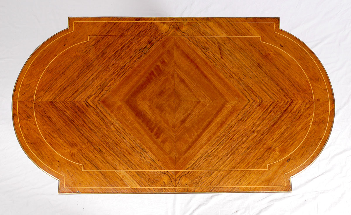 FRENCH PARLOR / LIBRARY TABLE: Matchbook veneer top with string inlay, skirt with single drawers, fluted tapered legs, shaped stretcher with urn center finial. 29 1/4'' h. x 45 1/4'' x 25 1/4''.