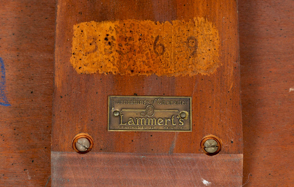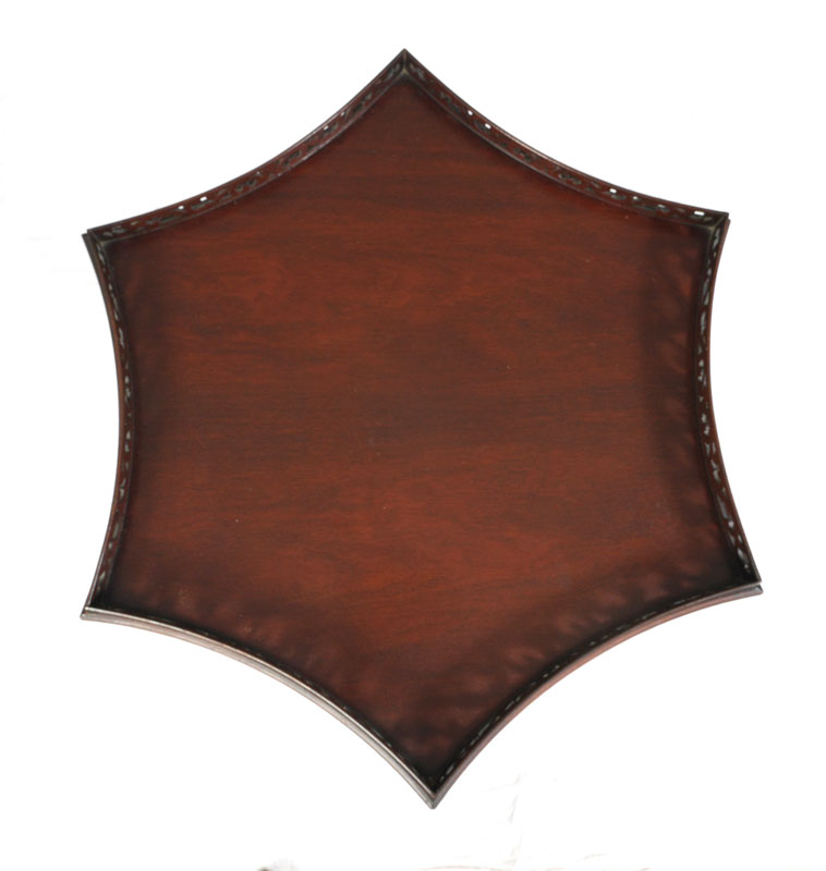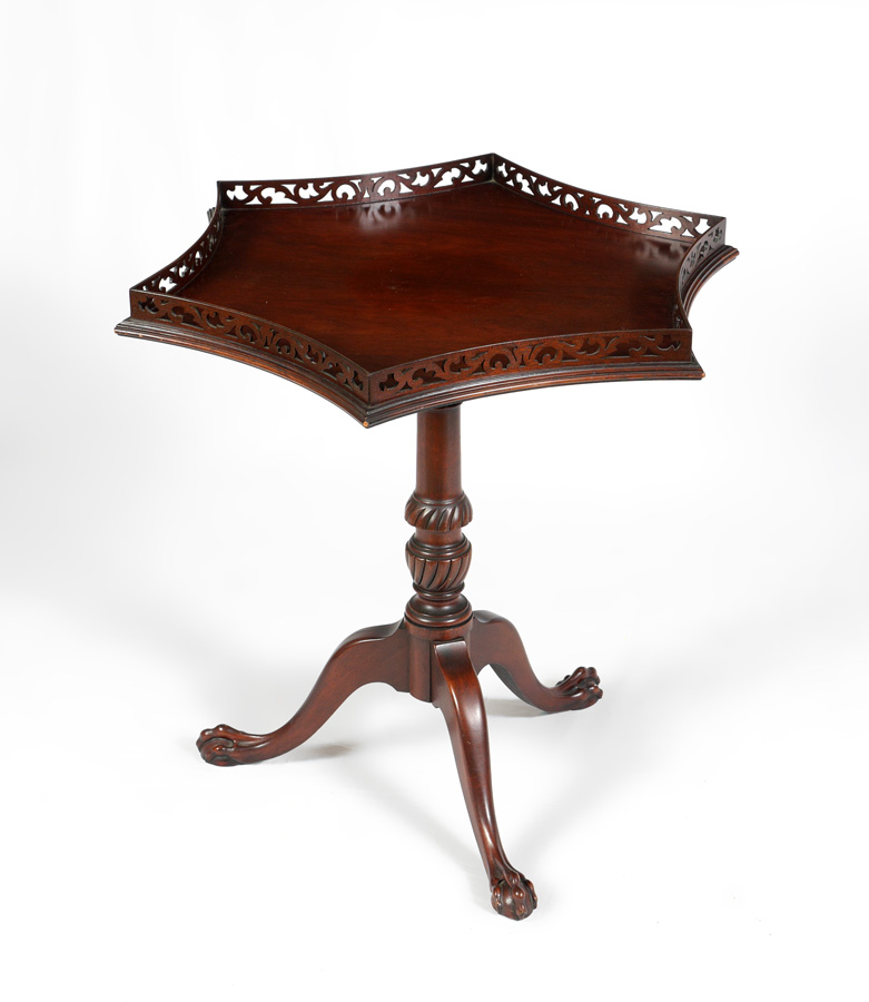 LAMMERT'S SCALLOPED HEXAGON OCCASIONAL TABLE: 6 sides top with shaped sides, pierced gallery, carved and turned column, shaped legs ending in claw and ball feet. Lammert's Furniture tag under top, measures 29'' h. x 30 1/2''.