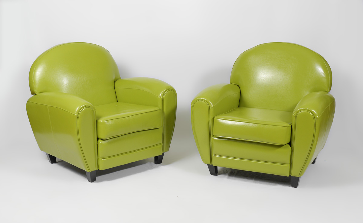 2 GREEN LEATHER CLUB CHAIRS: Contemporary green bonded leather chairs, wood legs, each measures 36'' h. x 36'' x 33 1/2''.