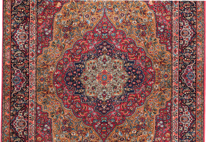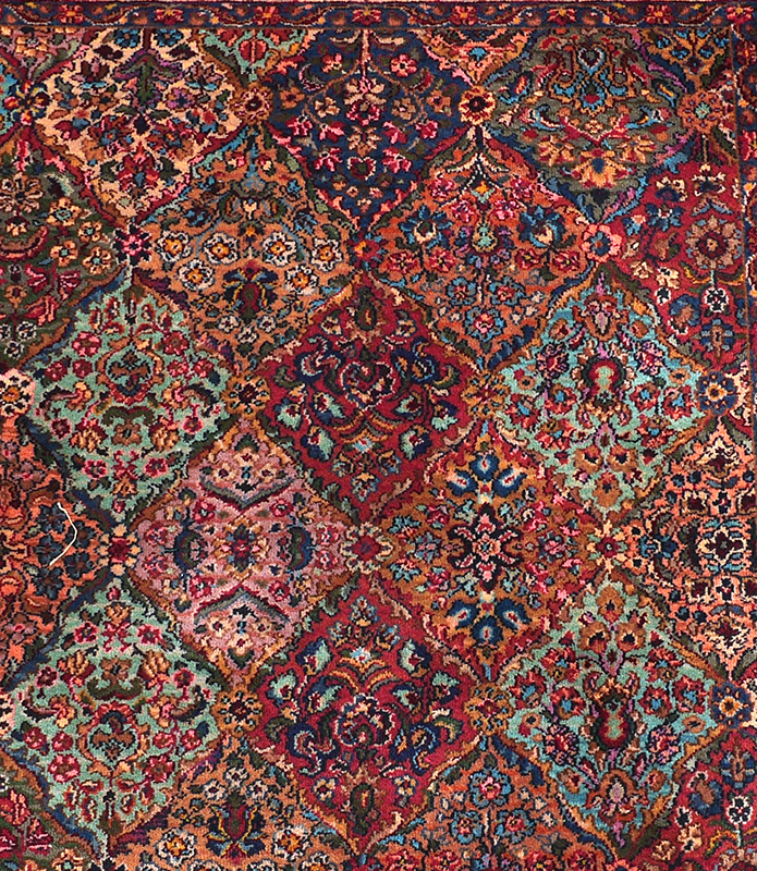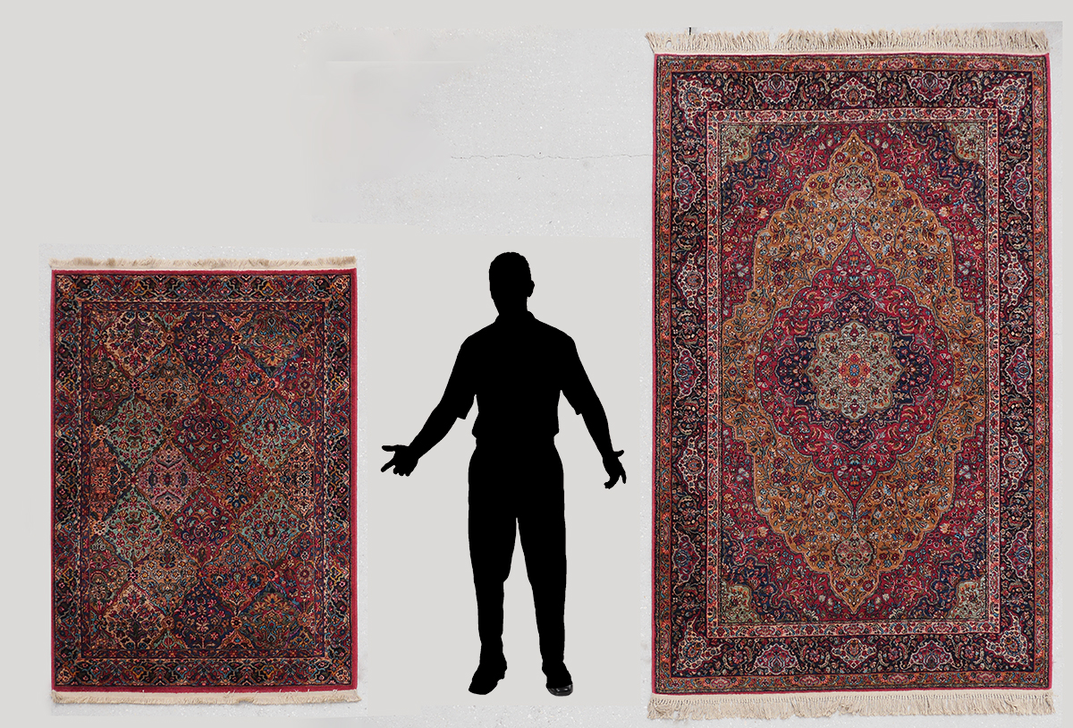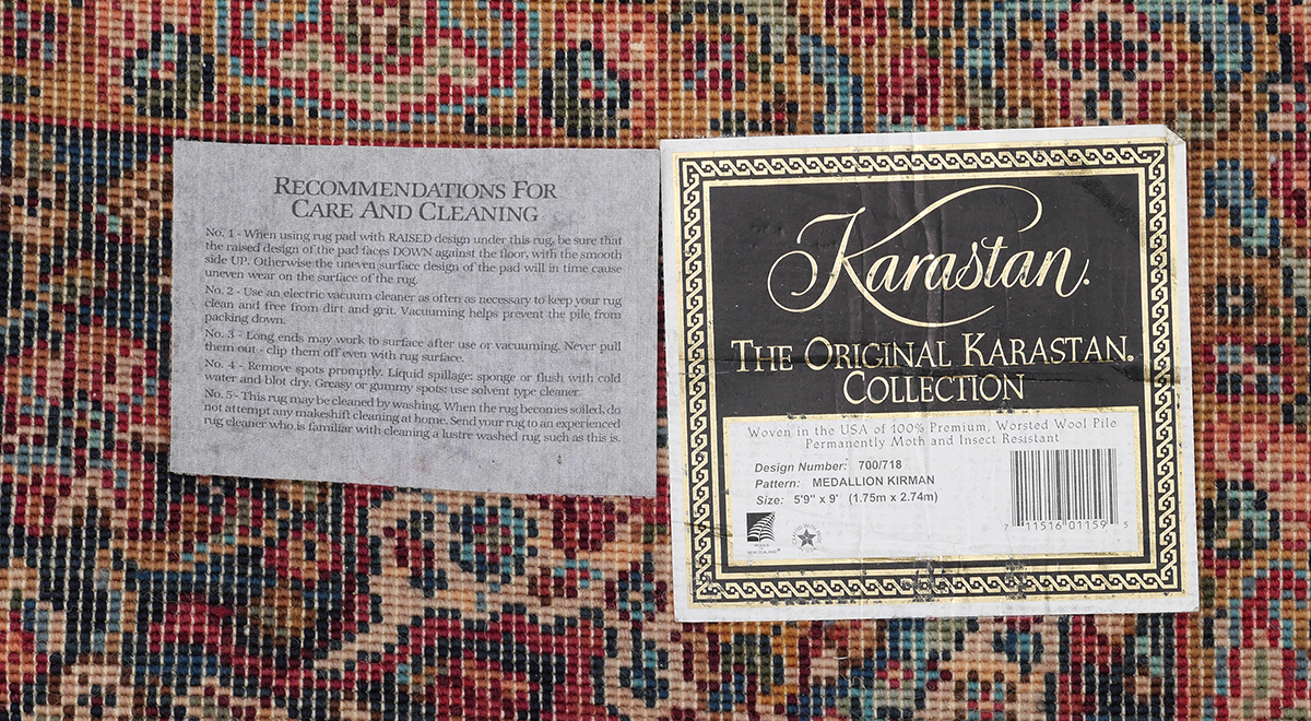 APPROX 25-50 YR OLD KARASTAN KERMAN MACHINE MADE WOOL RUGS, 4'3'' X 6' AND 5'9'' X 9': These two pretty carpets are from Karastan's 700 Series. Inspired by prized museum pieces and antiques, the 700 Series Collection of rugs is recreated from Persian, Turkoman, and other handwoven Orientals while maintaining authenticity to the finest detail. Each rug is Axmjnster woven through-the-back of the finest imported skein-dyed and lustre washed worsted yarns. Historically, the Axminlster loom and weaving technique date back to England in the 1800's. 1) 4'3''x6' Karastan Panel Kirman #717 Area Rug, has an overall pattern of rows of diamond shaped panels. 2) 5'9'' x 9' Original Karastan Medallion Kirman #718 Carpet features a curvilinear medallion design upon a field embellished with arabesques and floral motifs. Patterned after a nineteenth-century Kirman rug, it makes use of borders to showcase a spectrum of colors such as indigo blue, brick reds, tobacco golds, browns and olives with a smattering of soft aqua, coral and burgundy. Each color is specially dyed for a timeworn striated effect that recreates the antique beauty of the original. Woven in the USA of luxuriously soft premium worsted New Zealand wool.
