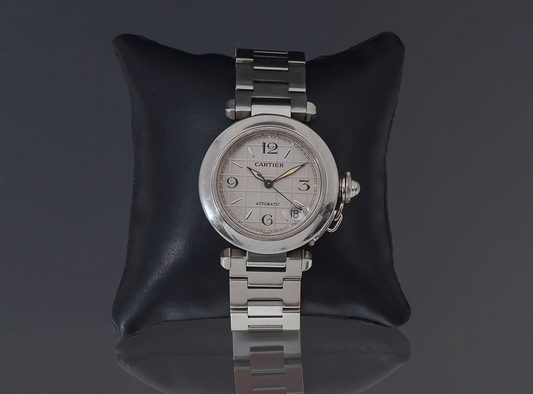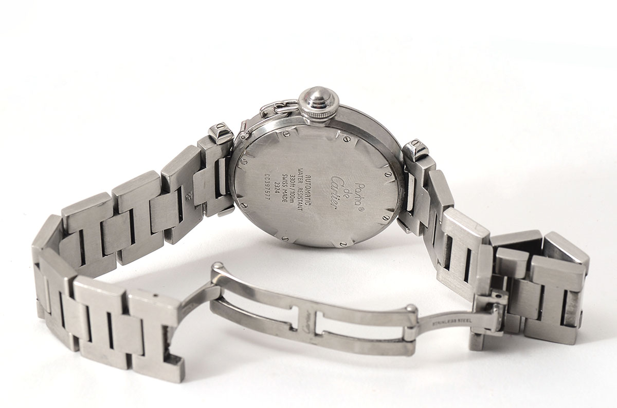 MIDSIZE 35MM CARTIER PASHA 2324 STAINLESS STEEL DATE AUTOMATIC WATCH: Unisex watch has an appealing brownish dial with analog display. The crystal is sapphire with a date display. The stainless band fits a 7'' wrist and has a butterfly clasp. Comes with ''Certificat de Garantie Internationale'' and papers showing it was serviced in Japan in 1999. Has all the correct markers and serial number.