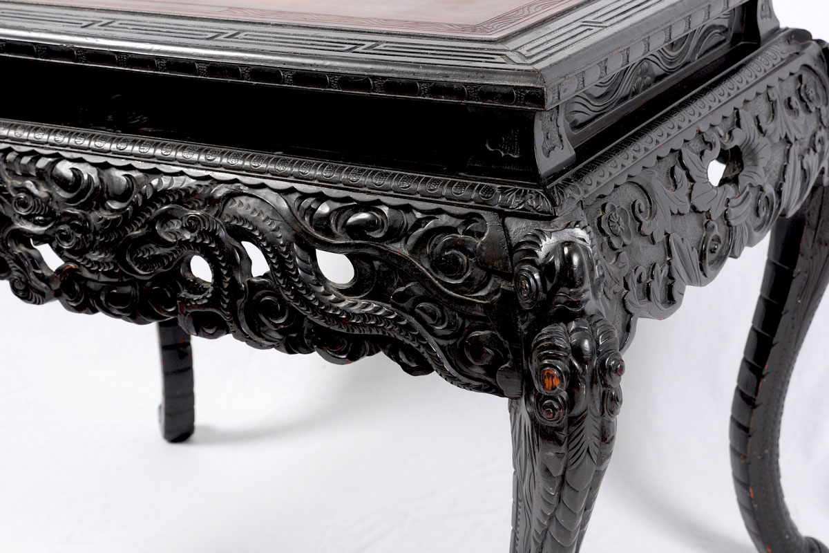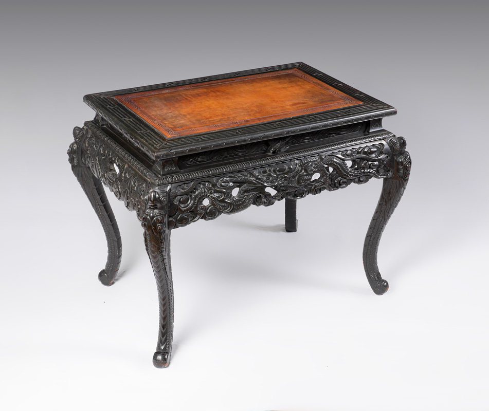 CARVED CHINESE DRAGON TABLE: Carved mixed wood top, skirt with openwork dragon and foliate motifs, carved and shaped legs, 29 1/2'' x 40'' x 29''.