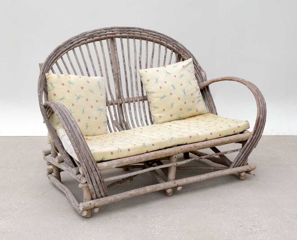 LA LUNE RUSTIC ADIRONDACK LOVESEAT: Bentwood loveseat / sofa from La Lune Collection of Wisconsin with a rustic distressed grey wash, dragonfly & ladybug motif cushion, matching throw pillow with addition foliate throw pillows. 39 1/2'' h. x 58'' x 37''.