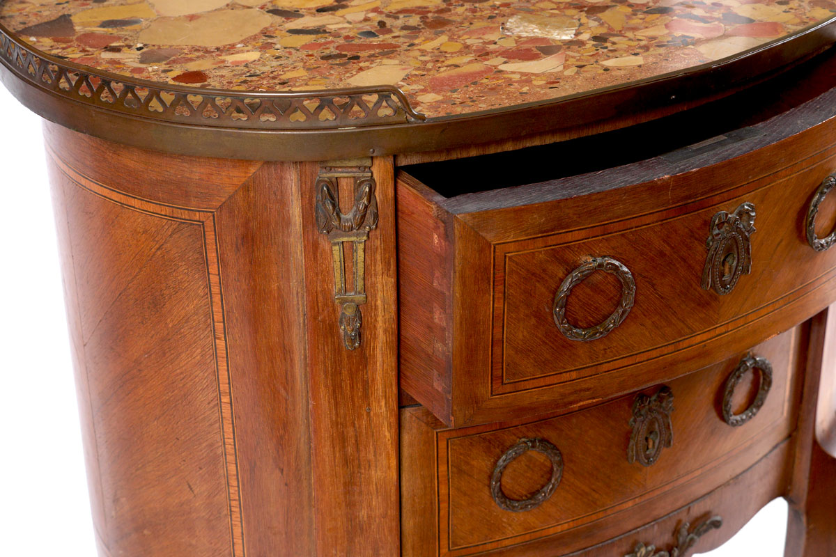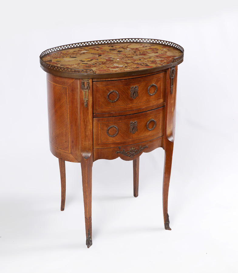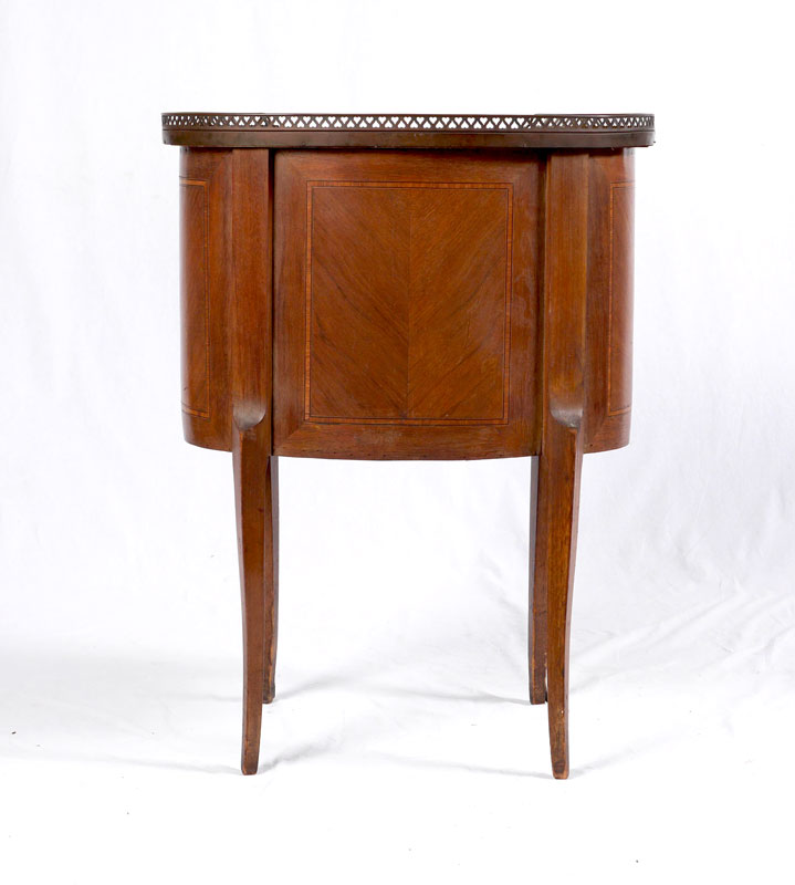 2 DRAWER MARBLE TOP SIDE TABLE: Pierced brass gallery, inset marble top, oval shape body with 2 drawers, string inlay, shaped legs, 31'' h. x 23 1/2'' x 15 3/4''.