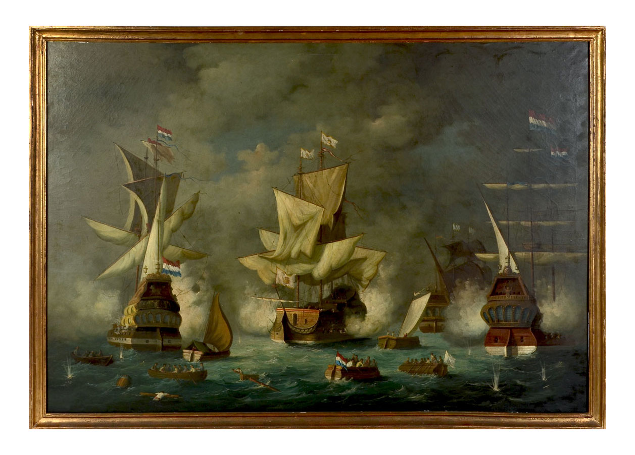 LARGE EUROPEAN NAVAL BATTLE PAINTING: 20TH C., Oil/Canvas, French vs unknown, 43.5'' x 63'', unsigned, framed, 46.5'' x 66''.