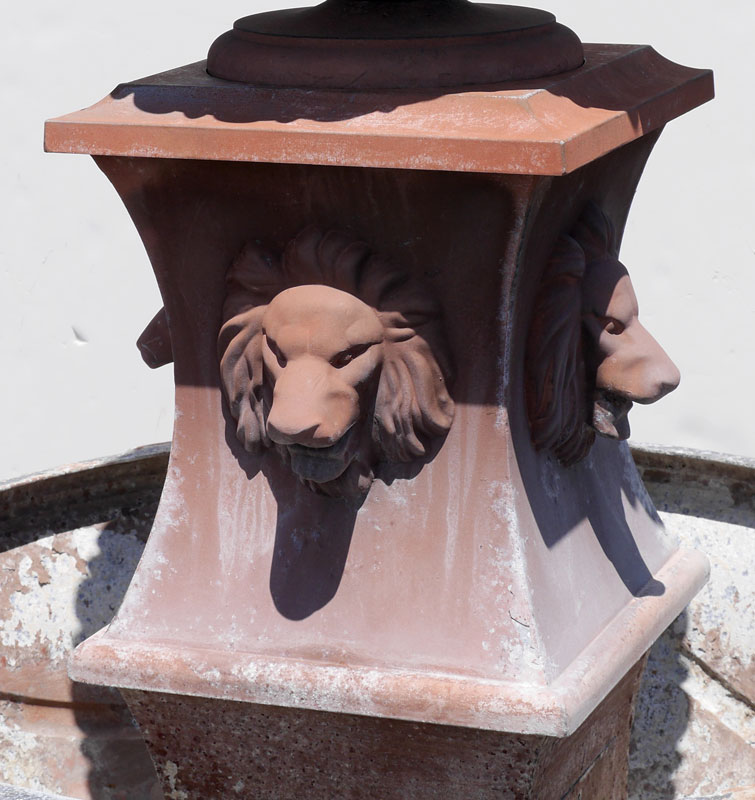 CAST ALUMINUM LION MASQUERON OUTDOOR FOUNTAIN: Urn finial over 4 lion masqueron spouts, large bowl on base with stylized feet. Overall 54 1/2'' h. x 40'' dia.