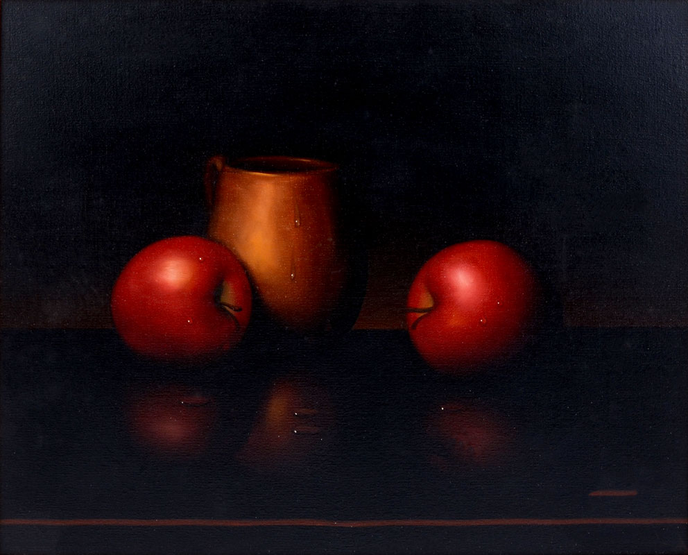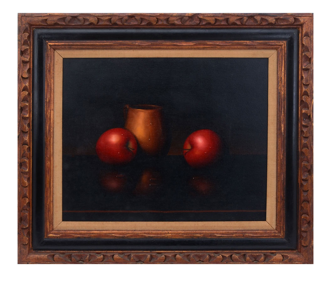 JACKSON, Alfred, (American, 1940-2001): Still Life with Apples and Copper Mug, Oil/Canvas, 16'' x 20'', signed lower right, framed, 24'' x 28''.