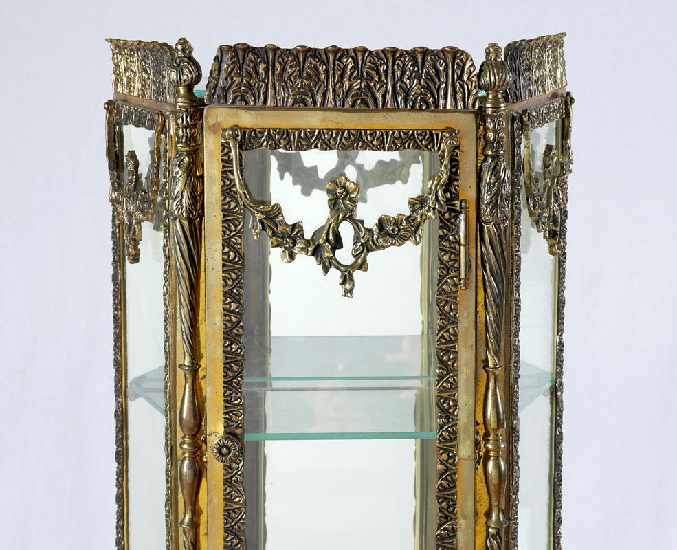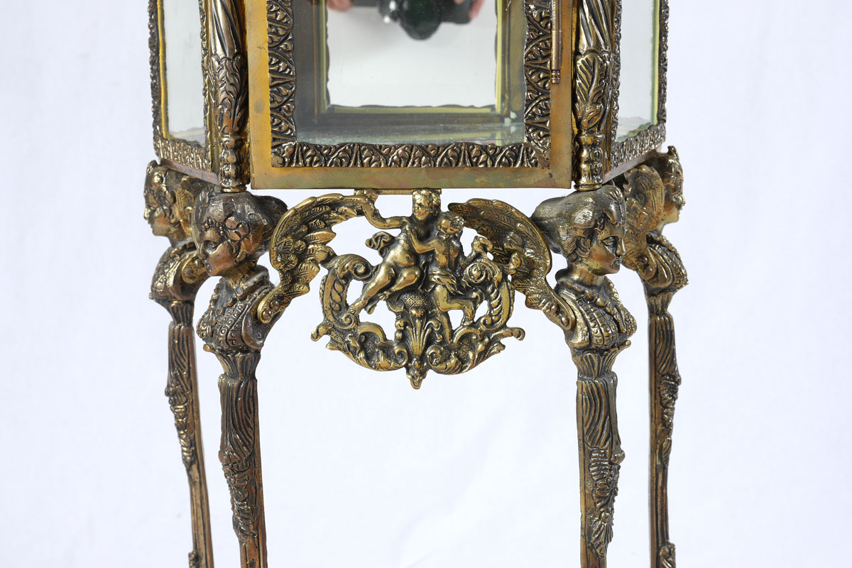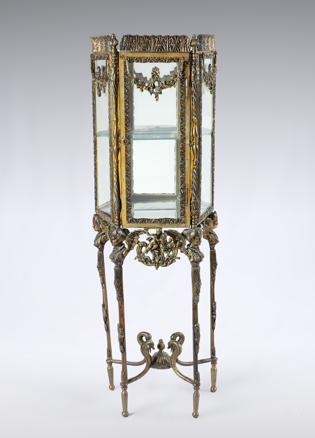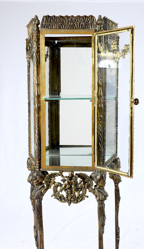 DIMINUTIVE ROCOCO STYLE DISPLAY CABINET: Cast brass frame, glass top, tapered sides and door. Skirt with neo-classic putti motif decoration. 4 winged maiden busts above legs, figural snake stretchers, overall 49'' h. x 16 1/2'' x 9''.