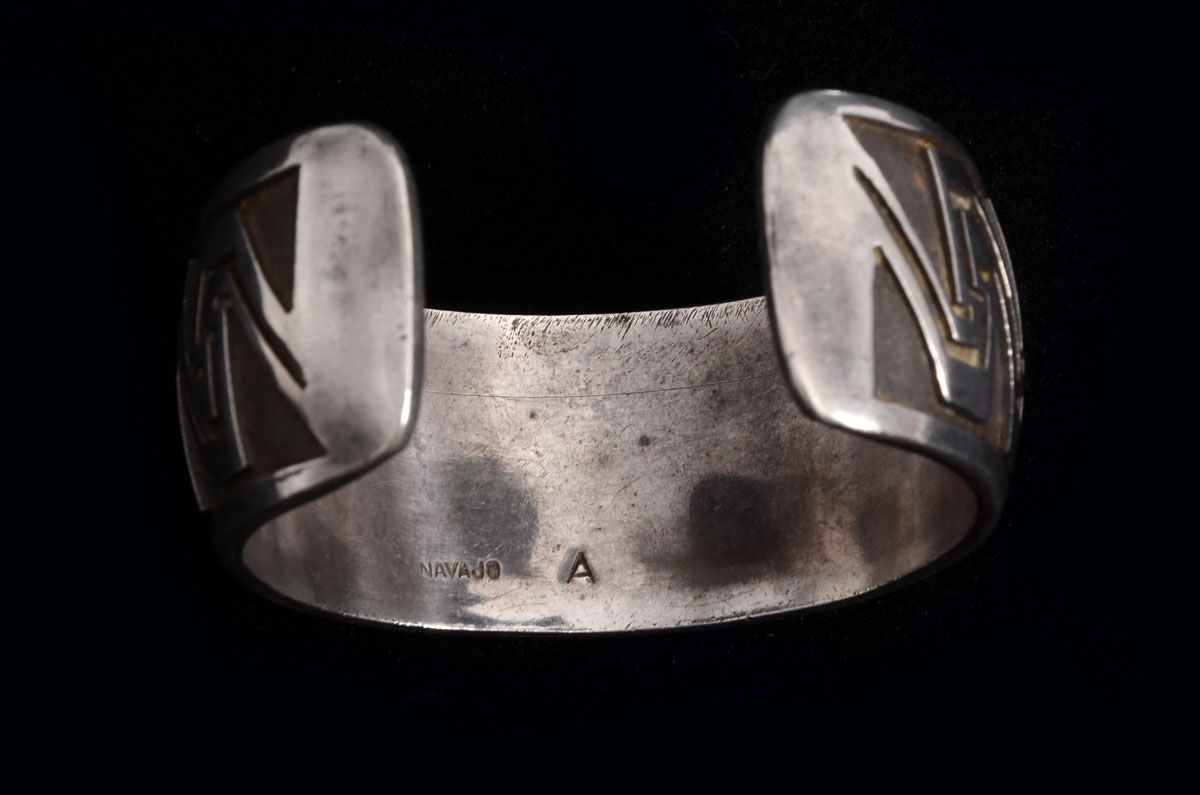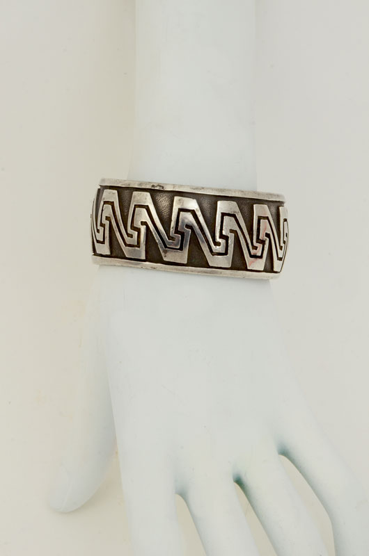 WIDE SILVER NAVAJO CUFF BRACELET: 1 1/8'' wide silver cuff bracelet with repeating stamp-work design. Measures approx 5.5'' inside not including opening. Opening is 1''. Total weight is 2.18 Troy ounces. Stamped Navajo.
