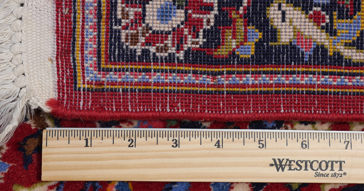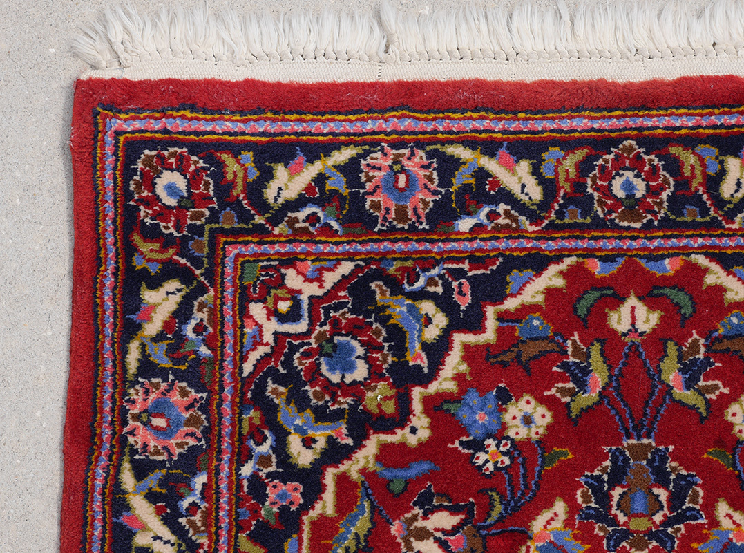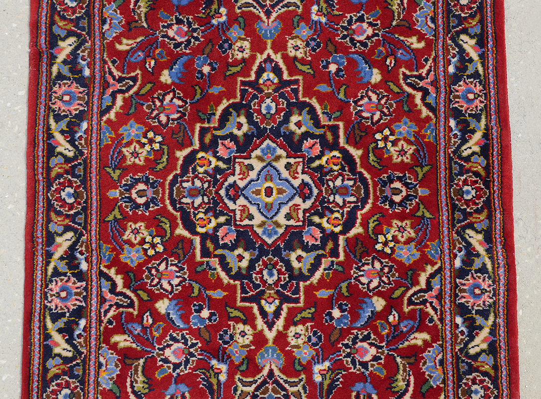 APPROX 20-40 YR OLD INDO-PERSIAN HAND KNOTTED WOOL RUG, 2'4'' X 4'3'': This rug has crisp and clear colors with its brick red field, its central medallion in dark & light blue, and white with spandrels at either end. The corners and the main border are primarily dark blue that matches the central medallion.
