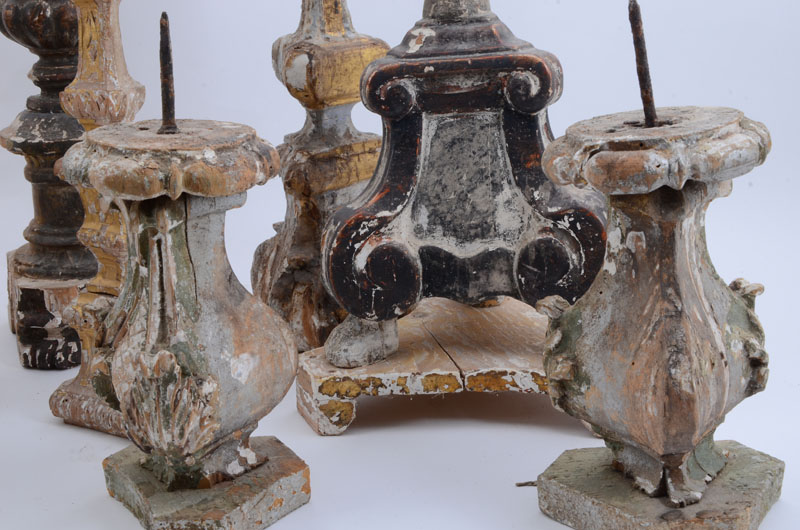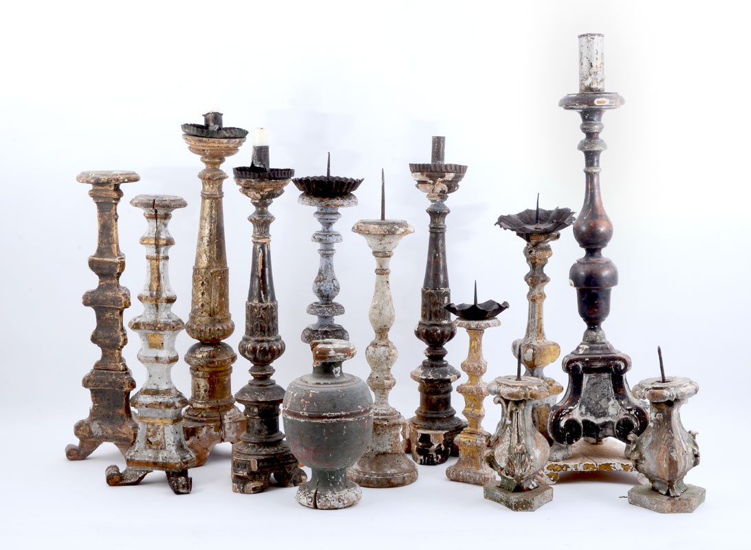 COLLECTION OF 13 CARVED WOOD CANDLESTICKS: 13 assorted candlesticks, likely Continental, most carved in the Italian rococo style, tallest 24 1/2'' x 7 1/2'', smallest 8 1/2'' h.