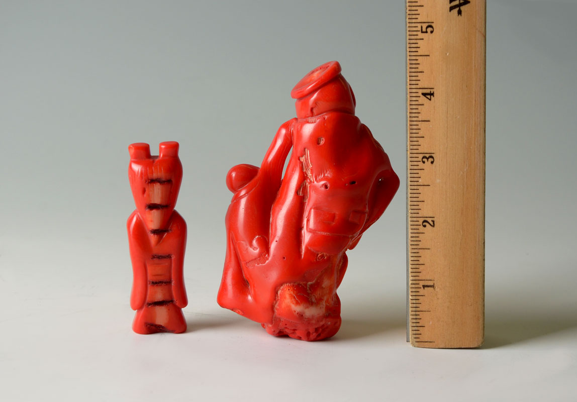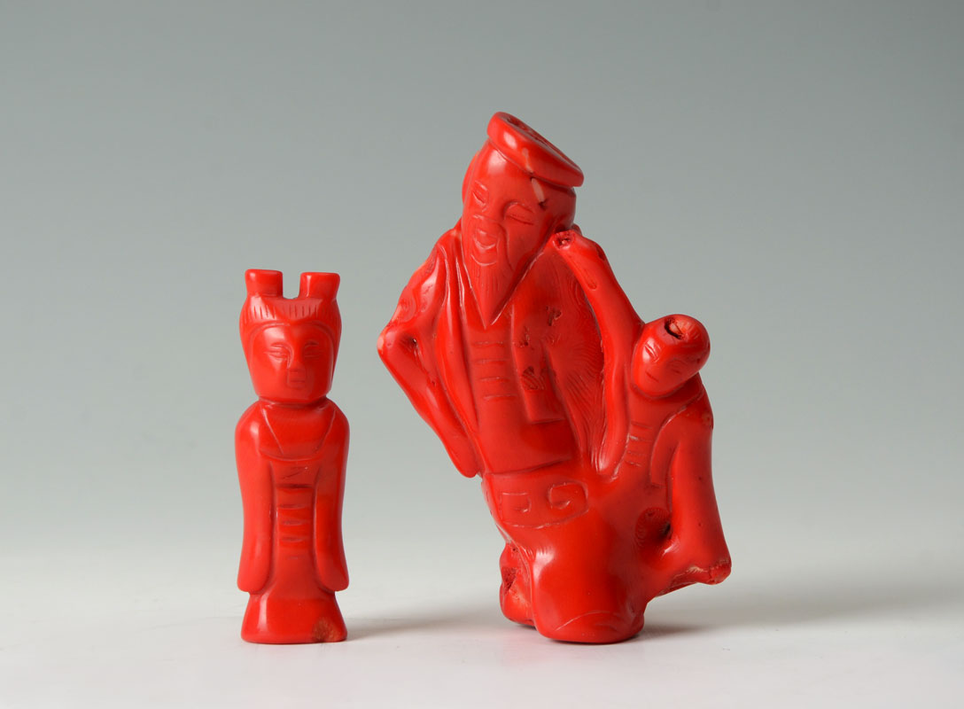 2 CHINESE CARVED RED CORAL FIGURES: 2 pieces total to include 1) Figural group of elder and attendant, 4 1/2'' h. 2) Single figure with robe, 3'' h. Please note color may have been enhanced. Approx. 275.8 grams.
