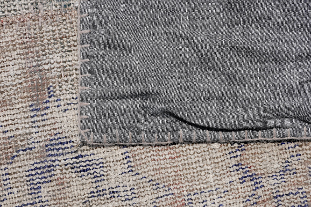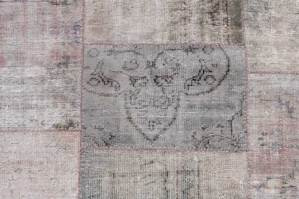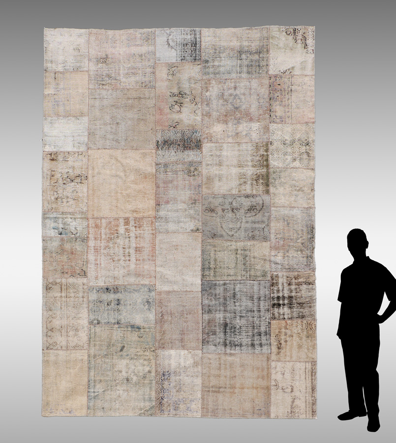 APPROX 10-25 YR OLD DECORATOR RUG, 8'5'' X 11': This Decorator piece has a design of panels or fragments of rugs that have been sewn together and then bleached or ''washed'' to unify the color to a certain extent.