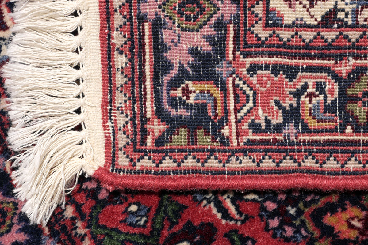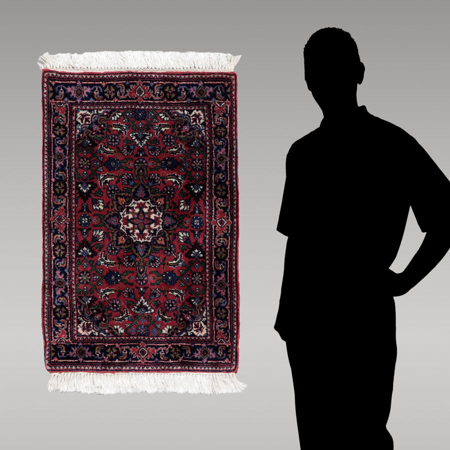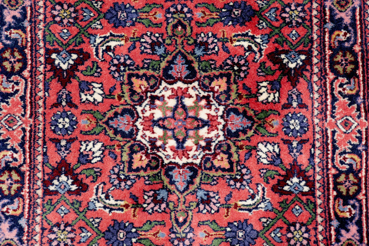 APPROX 20-45 YR OLD INDO-PERSIAN HAND KNOTTED WOOL RUG, 2'1'' X 3'': This rug has a pretty star shaped central medallion with a white center and multiple star points in dark blue, green, pink, and medium blue resting on a salmon pink field. The rest of the field is covered with a Persian Herati floral and curved leaf design that alternates with a sort of trellis design of vines. A dark blue border frames the field.