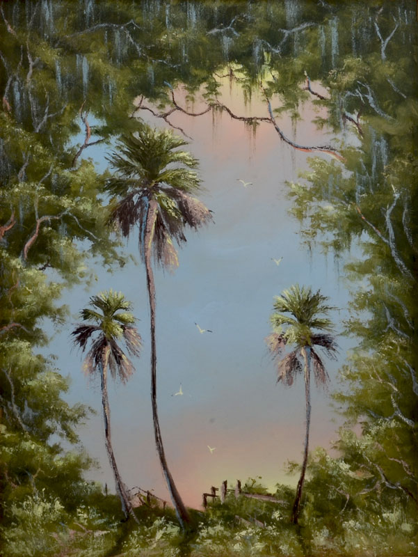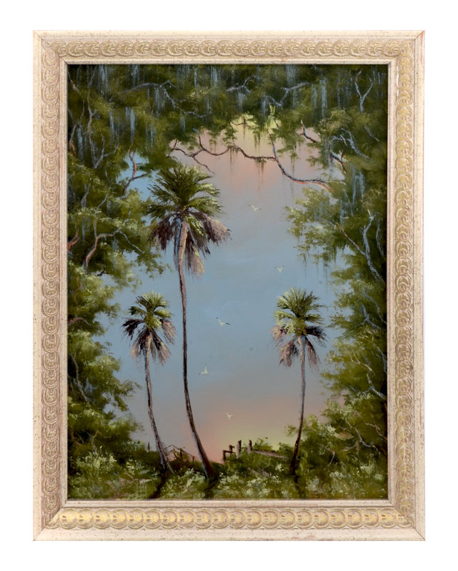 DANIELS, Willie, (American, 20th Century): Unsigned attribution to Willie Daniels, Florida Highwaymen landscape with trees, docks, and birds, Oil/Canvas, 24'' x 18'', framed 27'' x 21''.