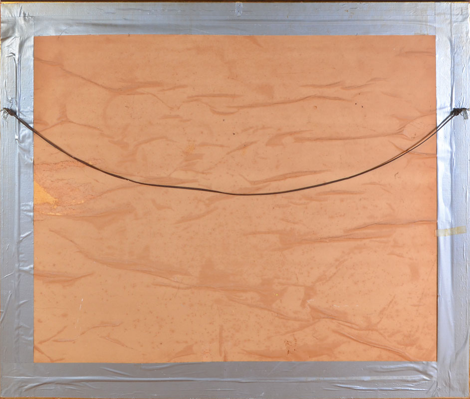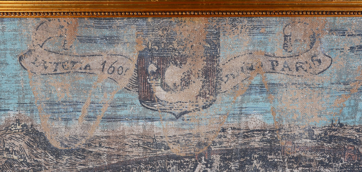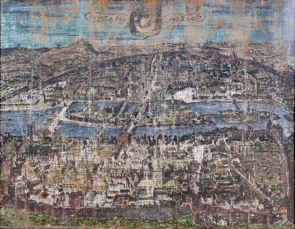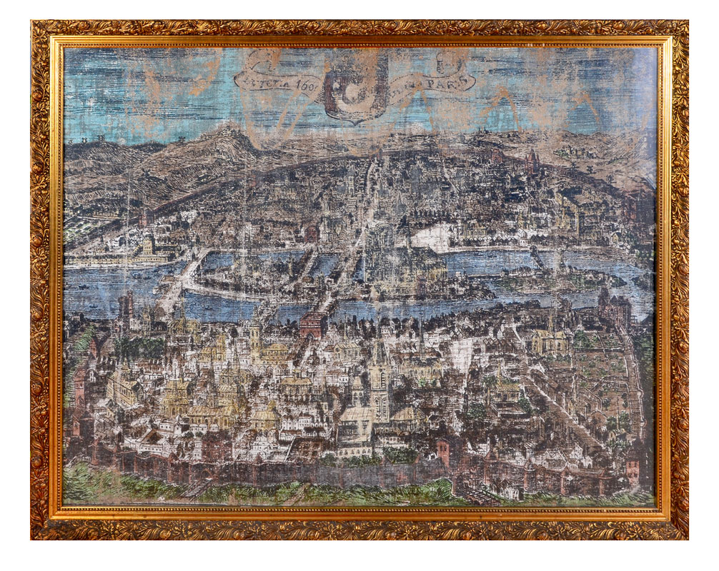 REPRODUCTION PAINTING OF PARIS MAP FROM 1600: Oil/Burlap Canvas laid on board, 37'' x 47'', framed, 41.5'' x 52''.