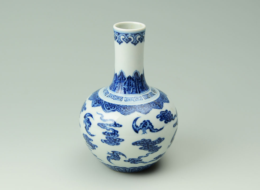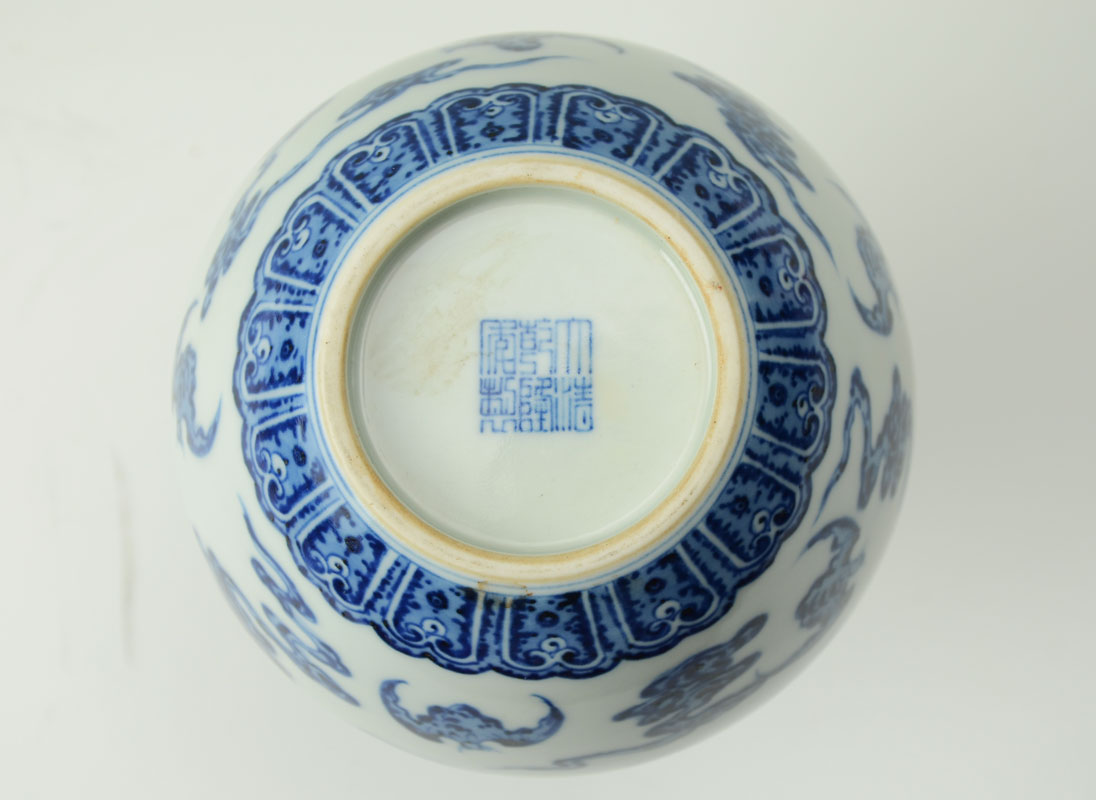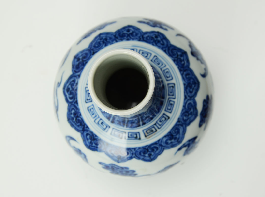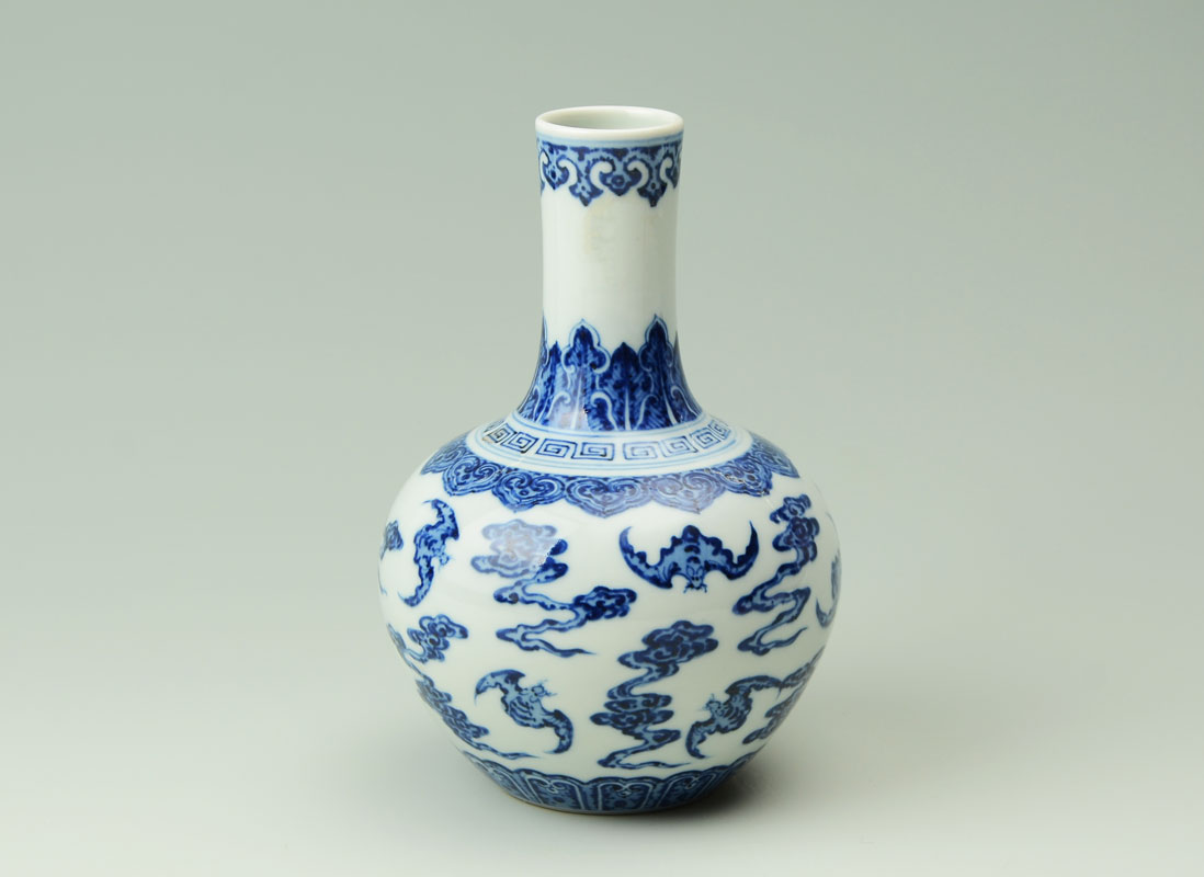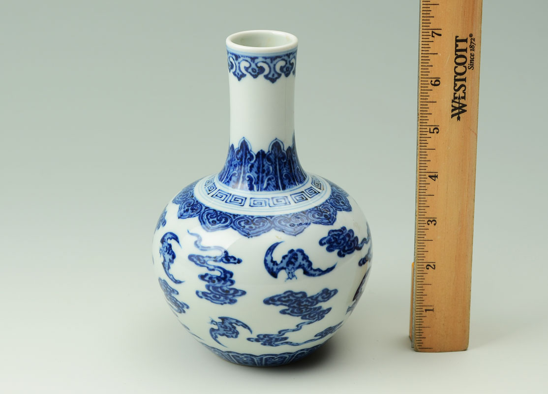 CHINESE BLUE & WHITE BAT DECORATED BOTTLE VASE: Cylindrical neck, bulbous body, blue & white decorated with bats and clouds motif. Bearing a blue Qianlong Qing dynasty mark, actual age unknown. 6 3/4'' h. x 4 1/2''.