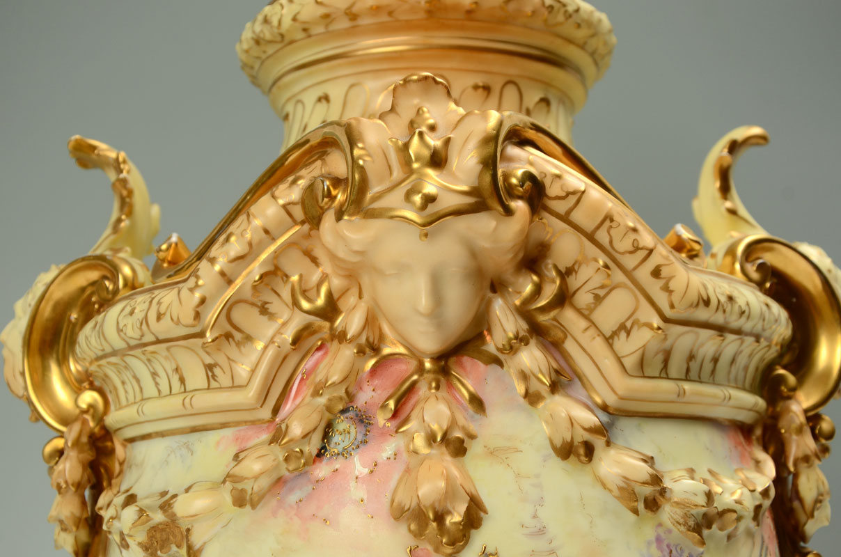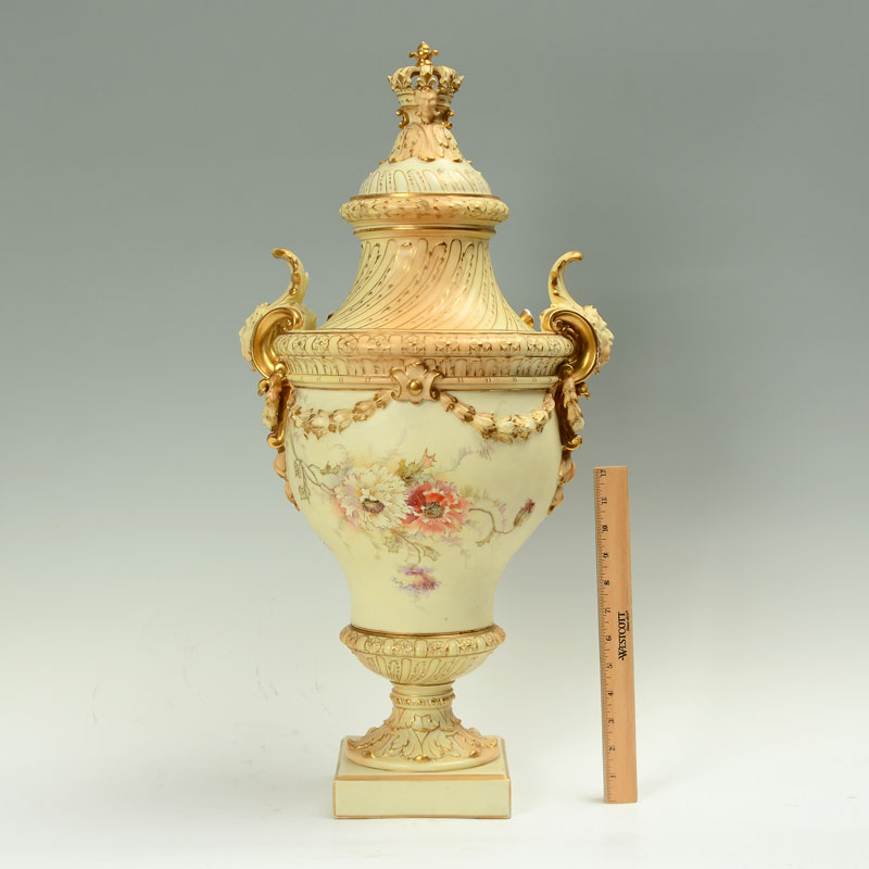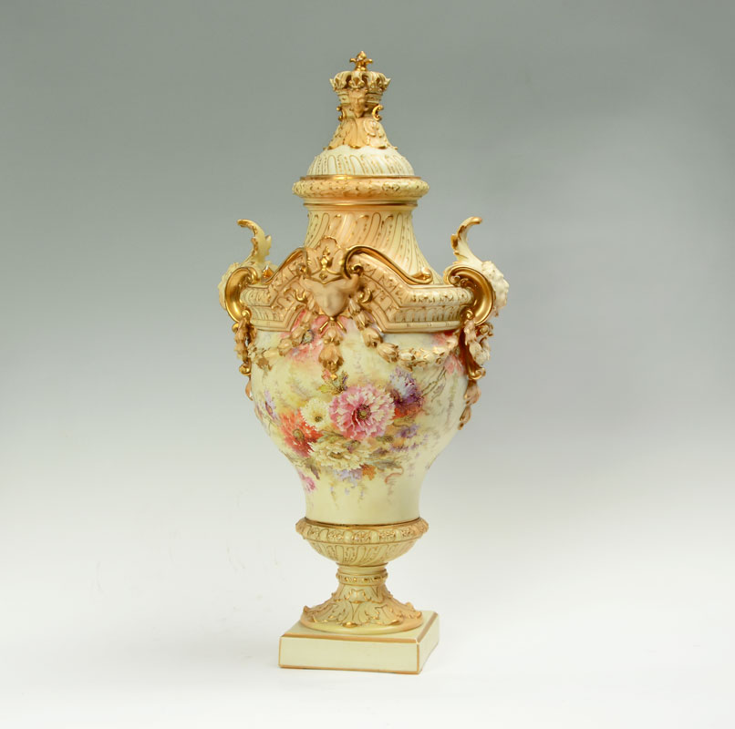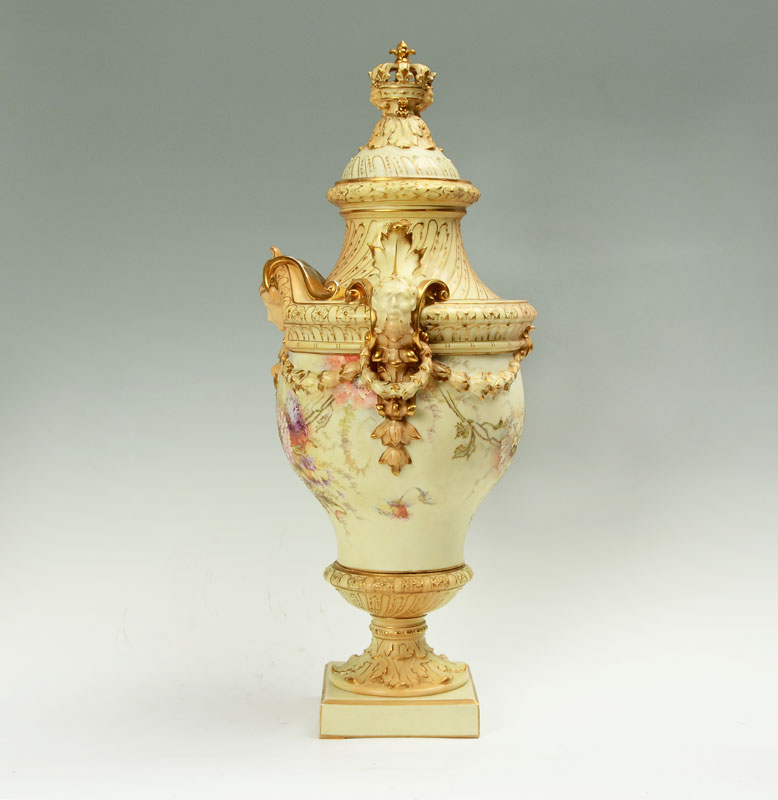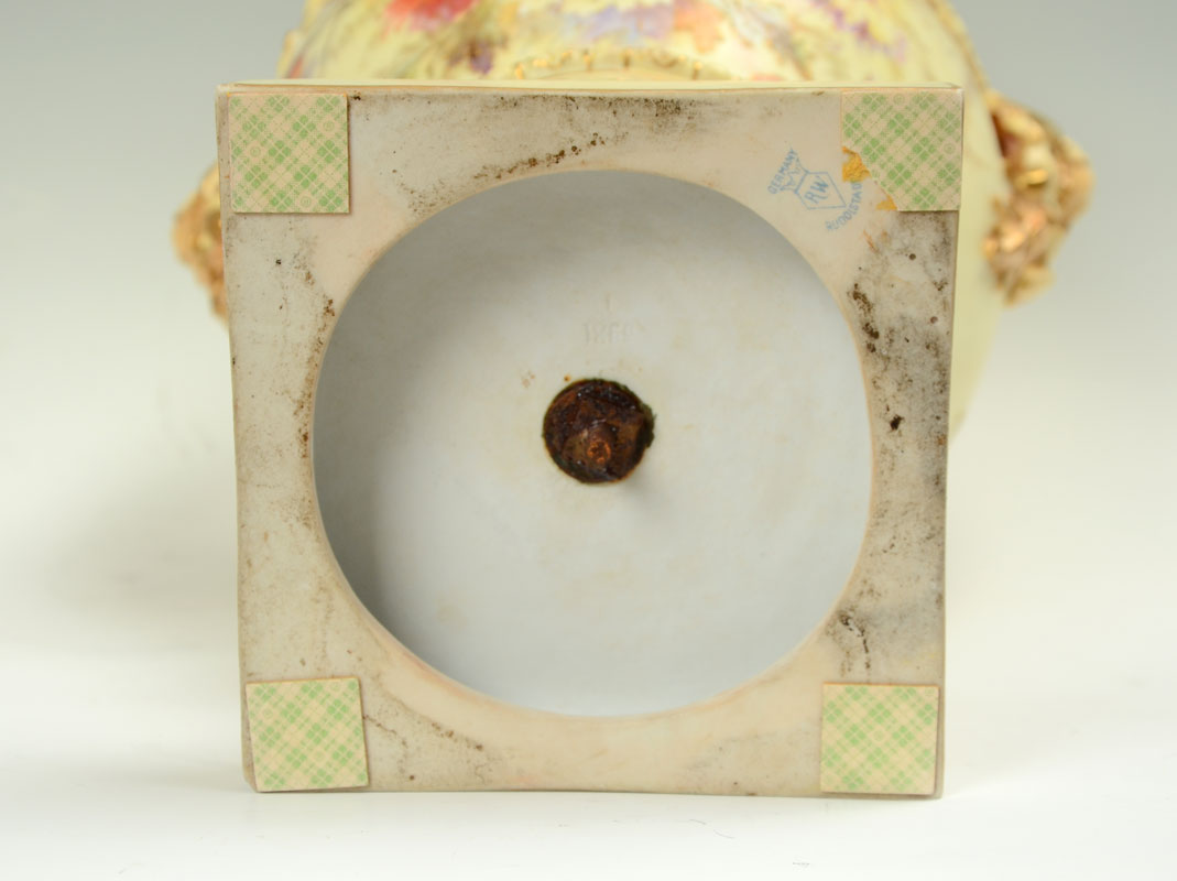 MONUMENTAL RUDOLSTADT GERMAN PORCELAIN URN: Lid with reticulated crown finial, body adorned with figural busts, bellflower swags, foliate handles, hand painted floral motifs, all on square foot. Rudolstadt Germany mark on base, overall 27 1/2'' h. x 14''.