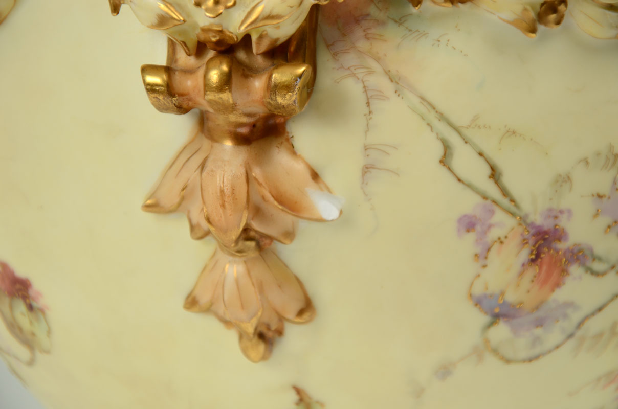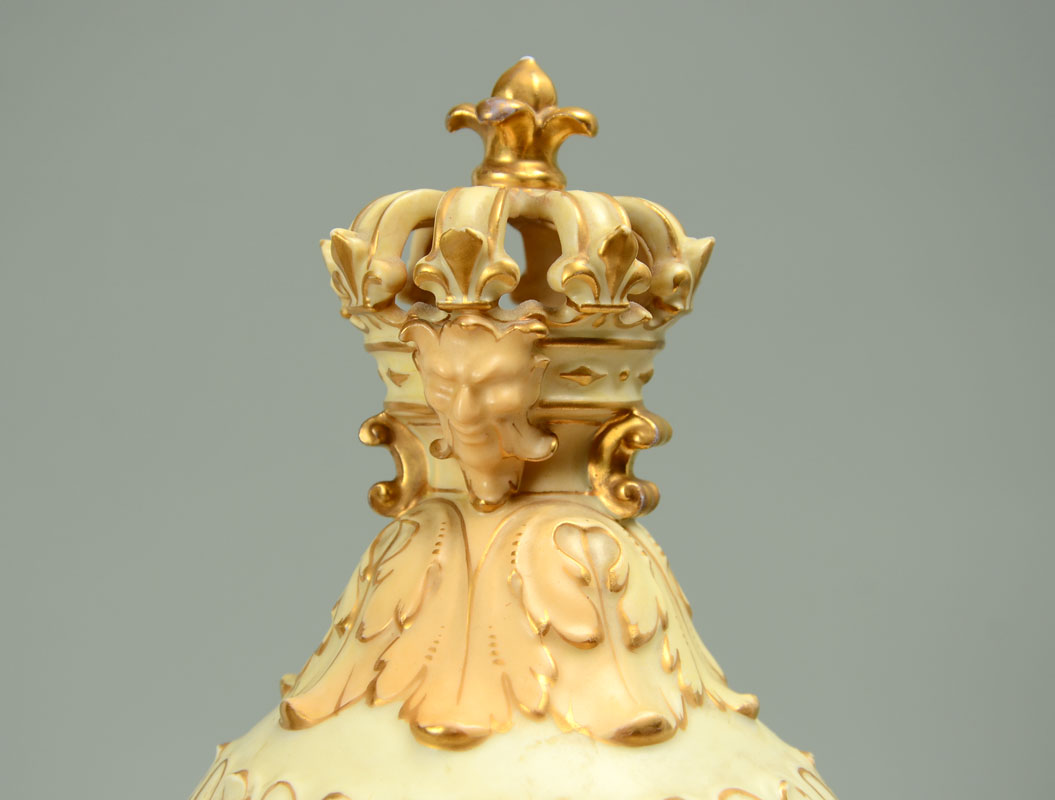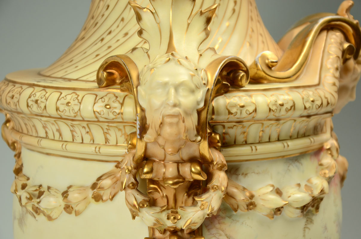 MONUMENTAL RUDOLSTADT GERMAN PORCELAIN URN: Lid with reticulated crown finial, body adorned with figural busts, bellflower swags, foliate handles, hand painted floral motifs, all on square foot. Rudolstadt Germany mark on base, overall 27 1/2'' h. x 14''.