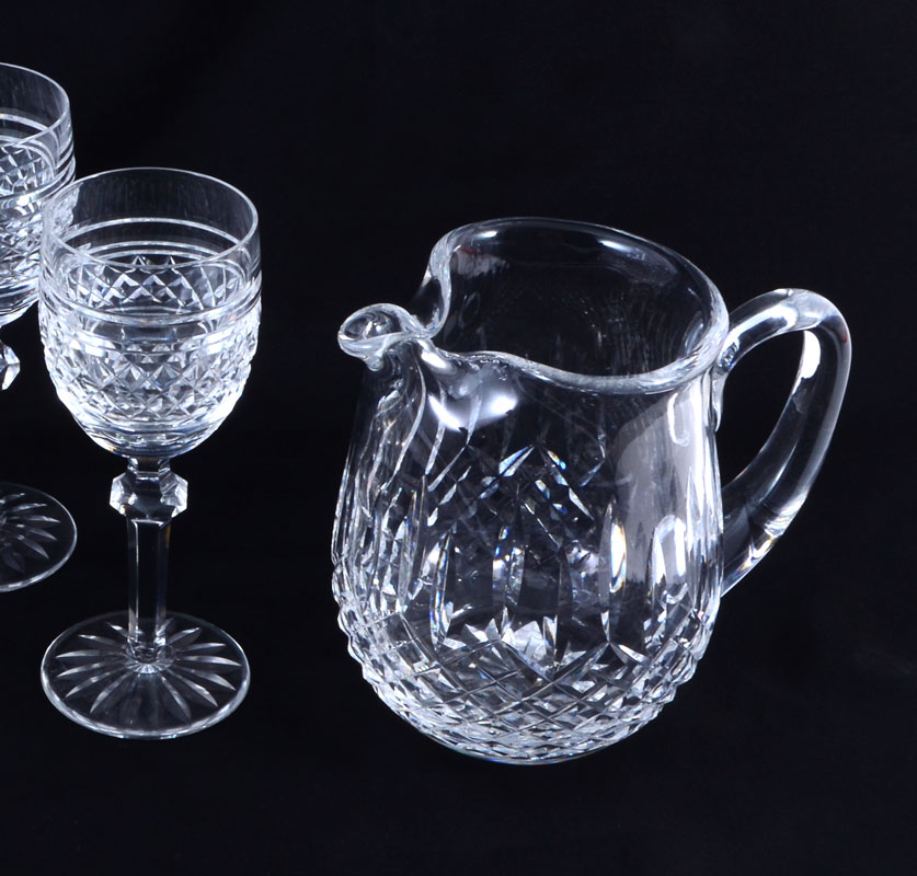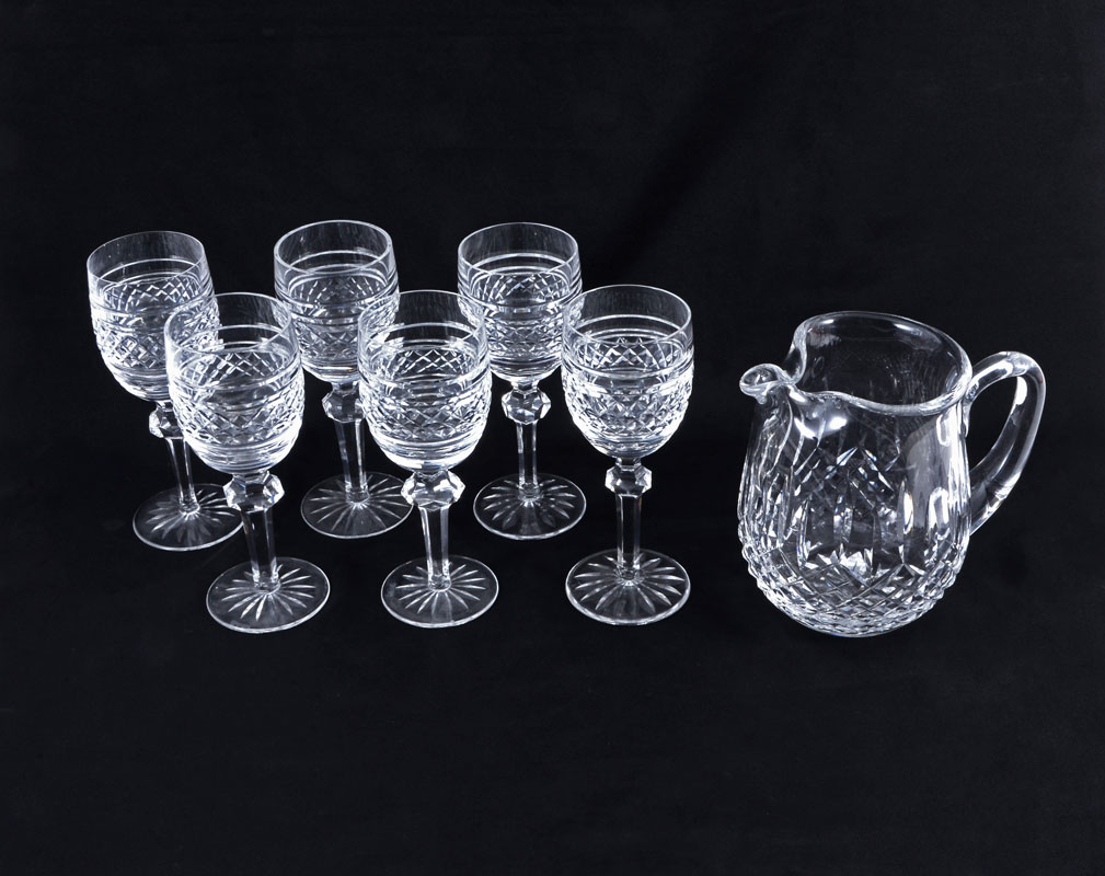 6 WATERFORD CASTLETOWN WINE GLASSES & LISMORE JUG: 6 claret wine glasses in the Castletown pattern by Waterford (7 1/8'' h.) and an ice lip jug in the Lismore pattern (6 1/4'' h. x 7'').