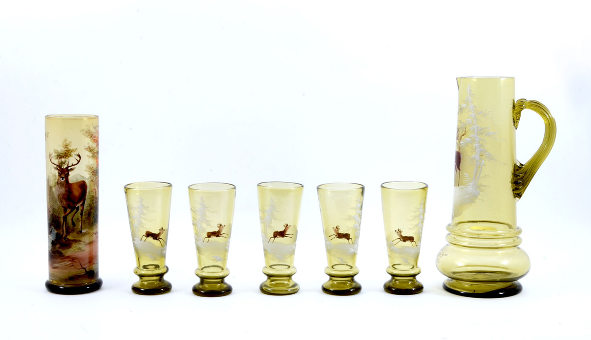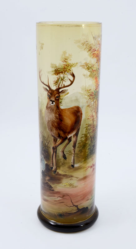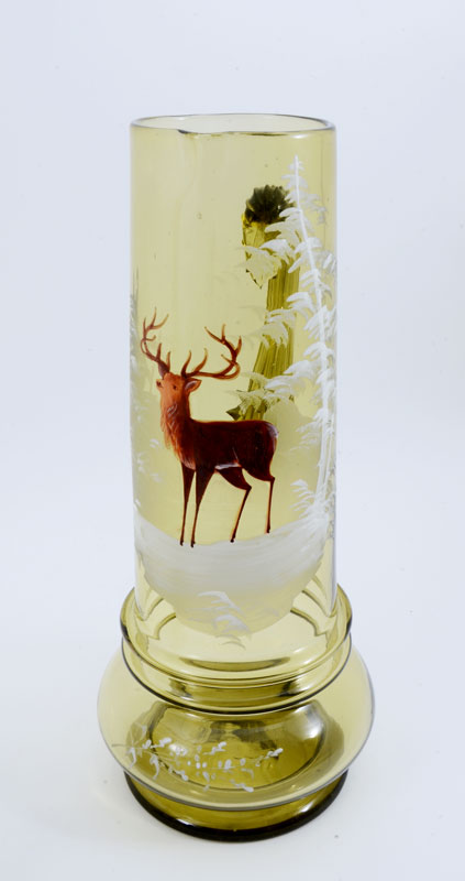 BOHEMIAN ENAMELED GLASS DEER LEMONADE SET: 7 pieces total with enameled stag in landscape decoration. To include a 6-piece lemonade set, pitcher (13'' h. x 9 1/2''), 5 glasses (6 1/2'' h.). Sold with a nicely detailed vase (10 1/2'' h.).
