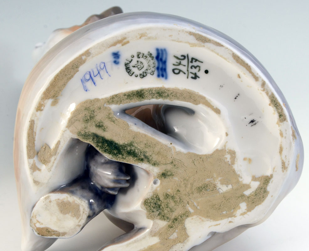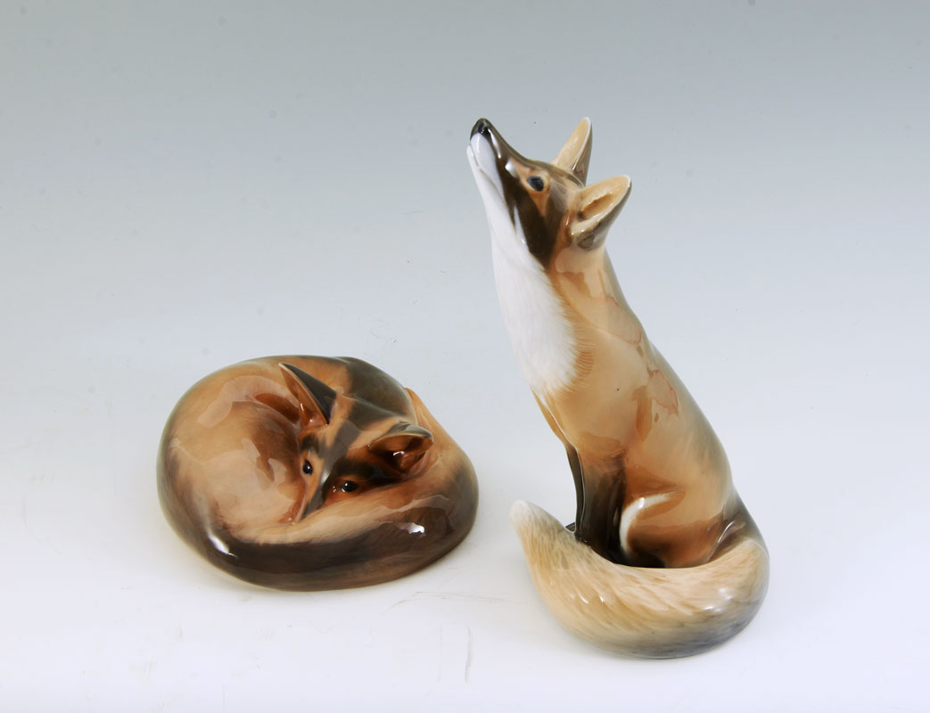 2 ROYAL COPENHAGEN PORCELAIN FOX FIGURINES: 2 figures total to include 1) 946/437 Howling fox, 10 1/2'' h. x 5 3/4''. 2) 438 Curled sleeping fox, 3 1/4'' h x 7''.