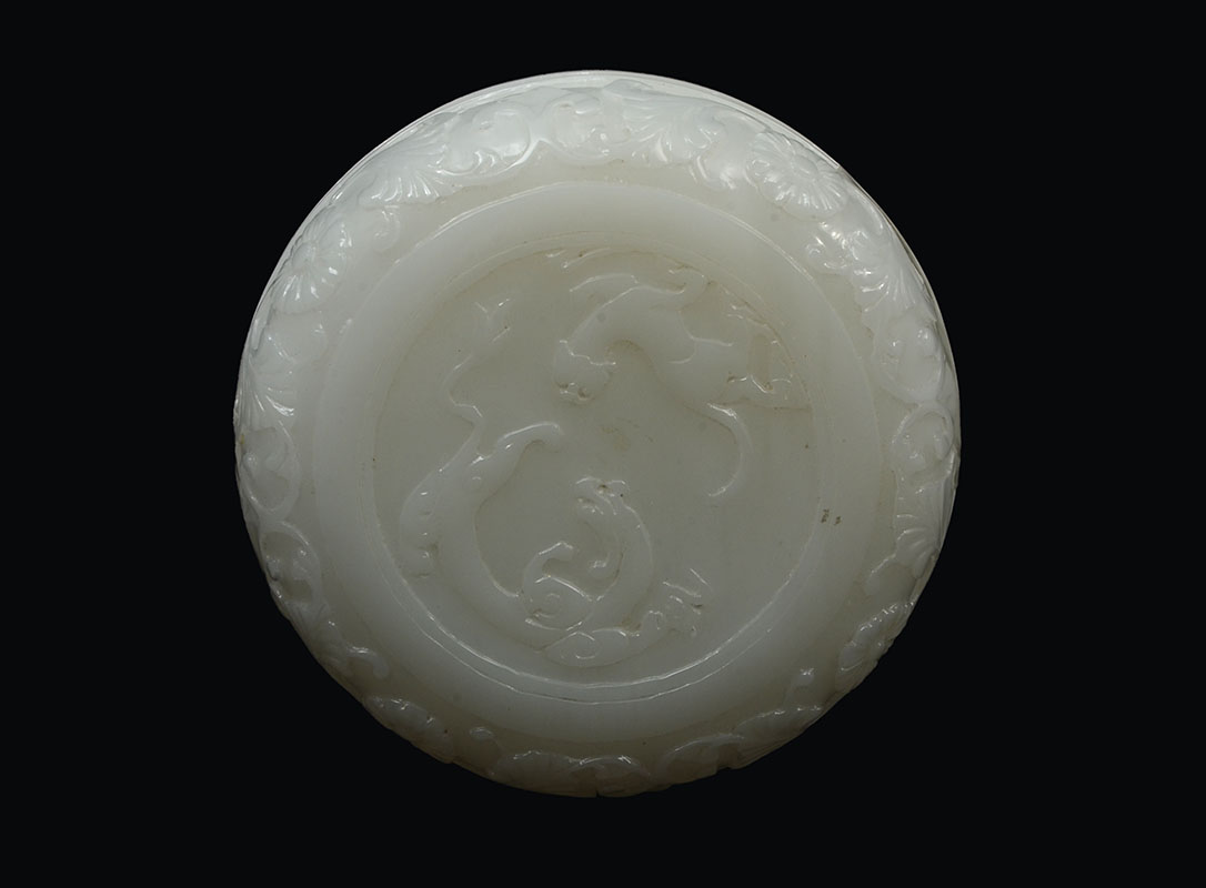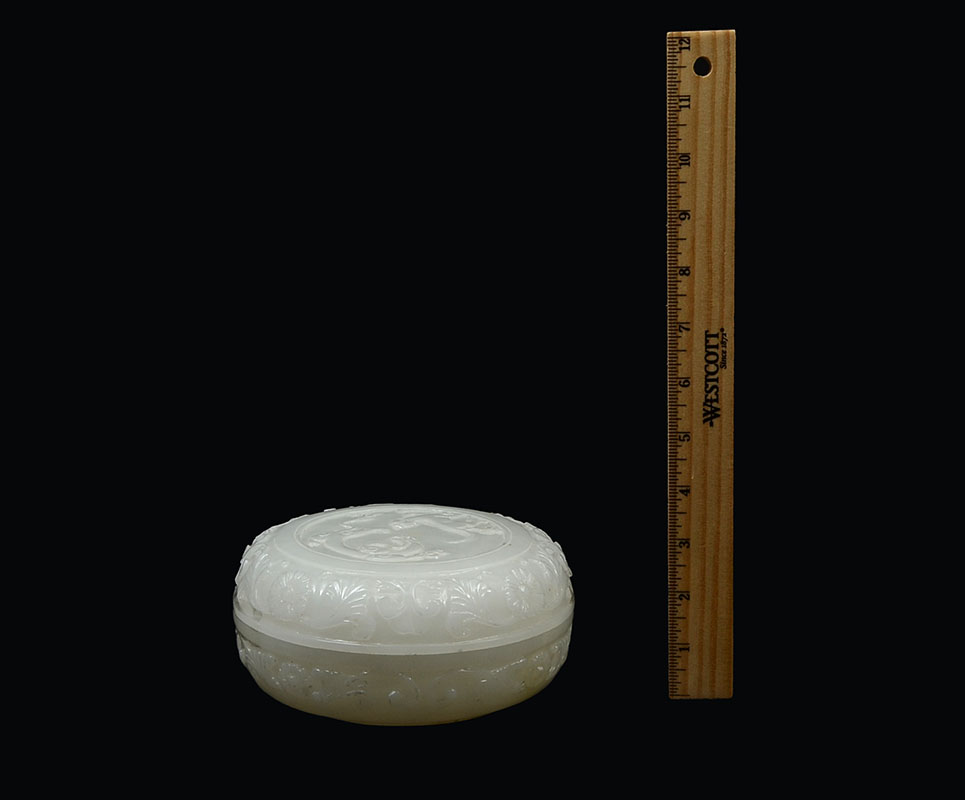 CHINESE WHITE COMPOSITE JADE COVERED ROUND BOX: Composite pressed white jade circular covered box, lid with relief figural cats in medallion top of lid, sides of body and lid with floral pattern. Measures 3'' h. x 6 1/2''