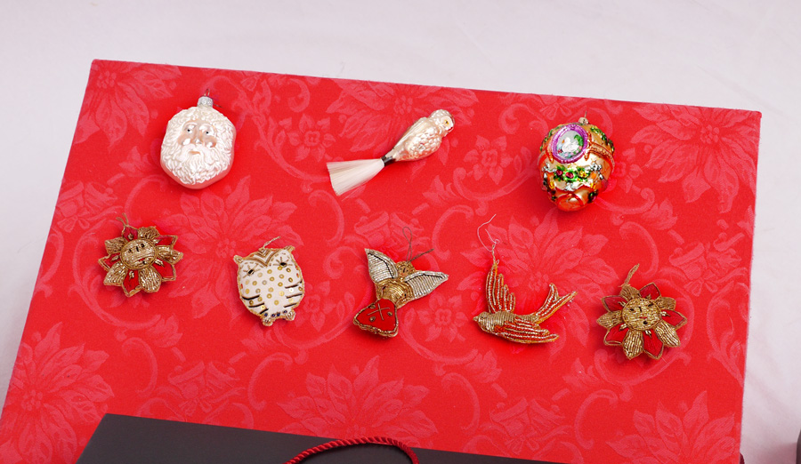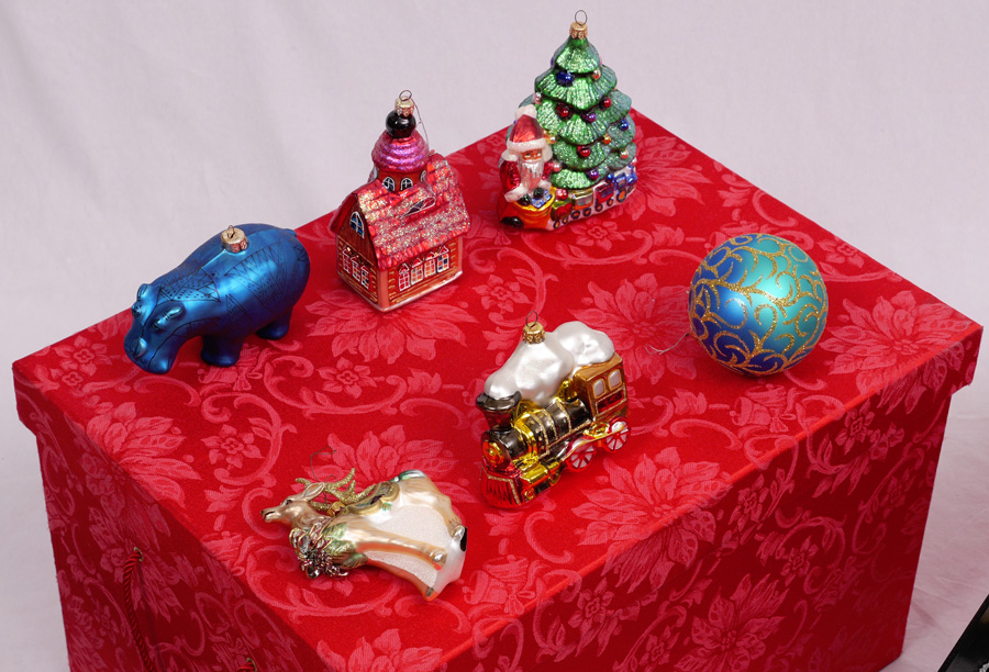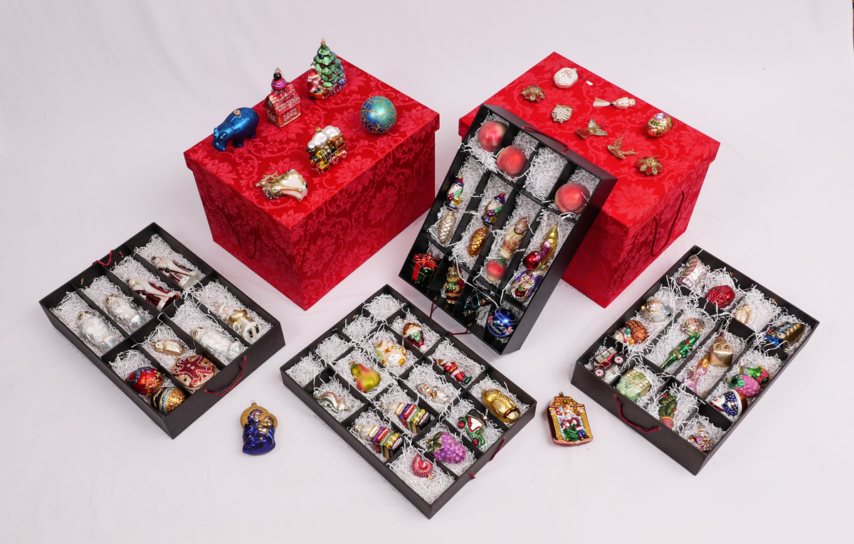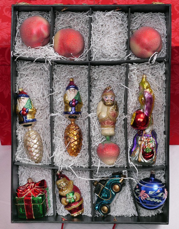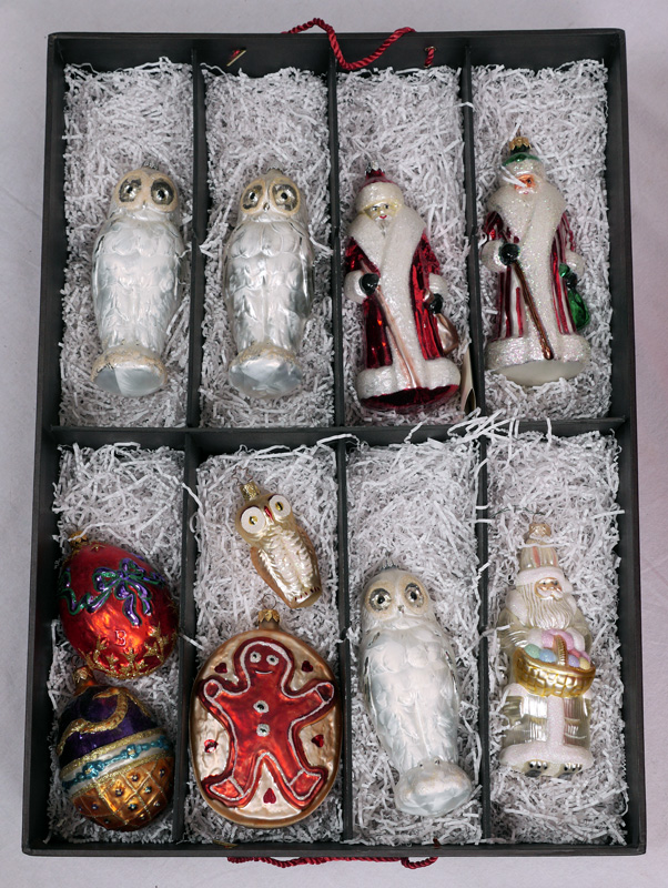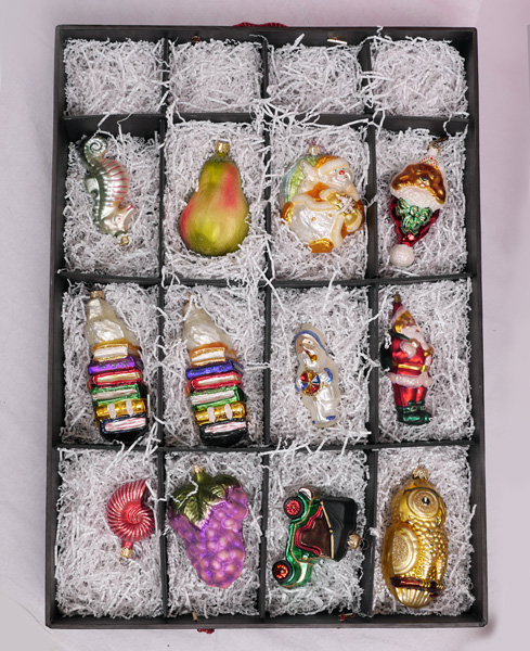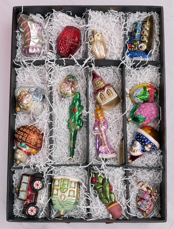 COLLECTION OF CHRISTOPHER RADKO & OTHERS ORNAMENTS: An assembled estate collection of approx. 66 glass Christmas tree ornaments by Christopher Radko & others. Various types, sold with 2 large compartmented storage boxes, 14 1/2'' h. x 22 1/2'' x 16 1/2''.
