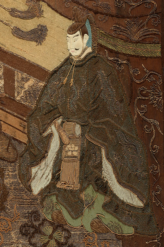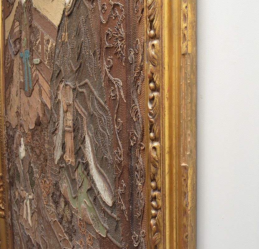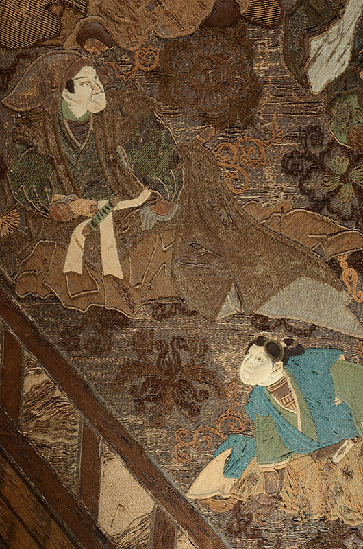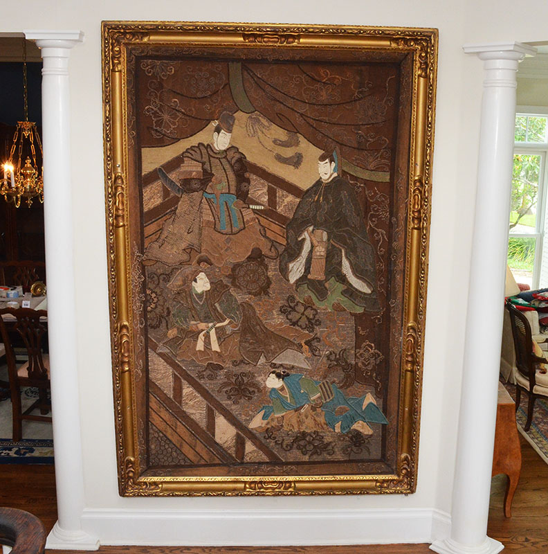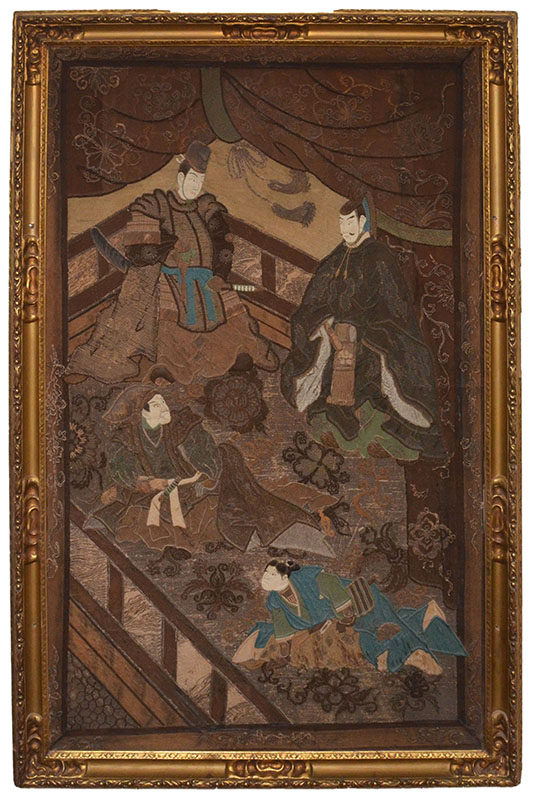 19TH CENTURY JAPANESE PICTORIAL EMBROIDERY TAPESTRY: Most likely Meiji period, nicely detailed pictorial tapestry with 4 shogun warrior figures in genre scene with raised faces, no visible signature, measures 78'' x 49'', gilt wood frame with old gallery tag on back 86'' h. x 57'' x 3''.