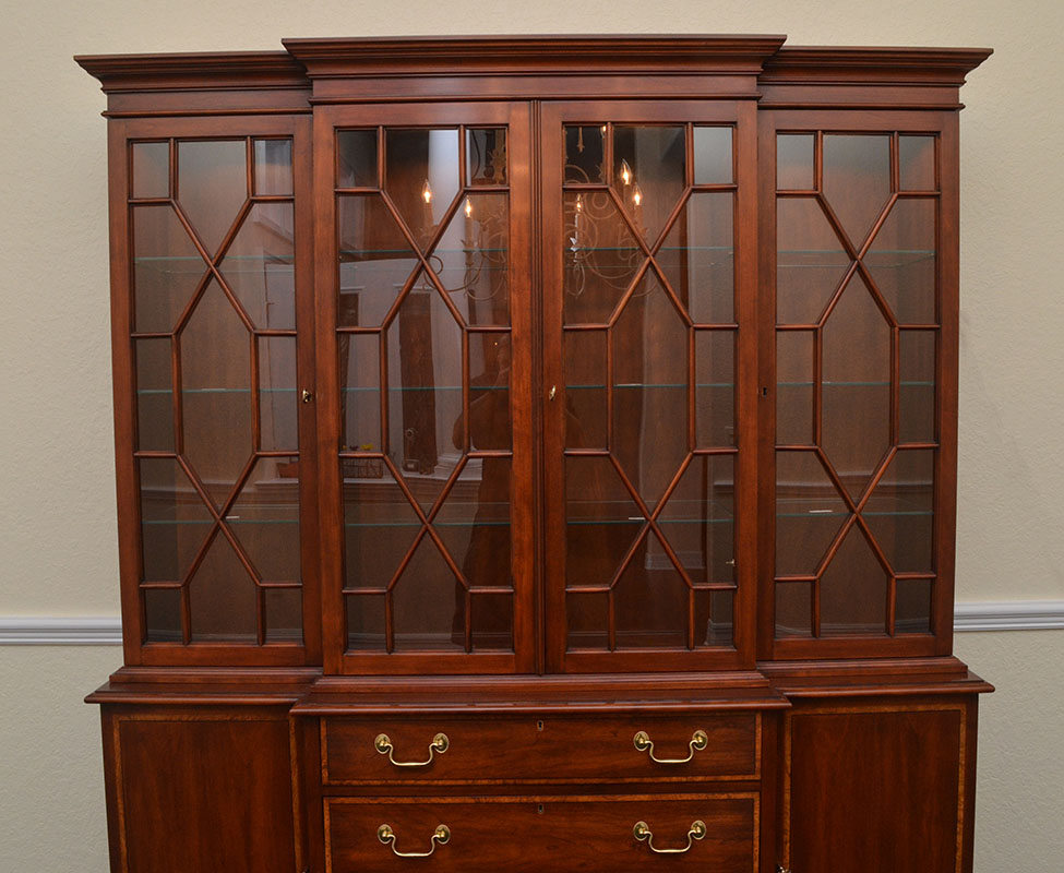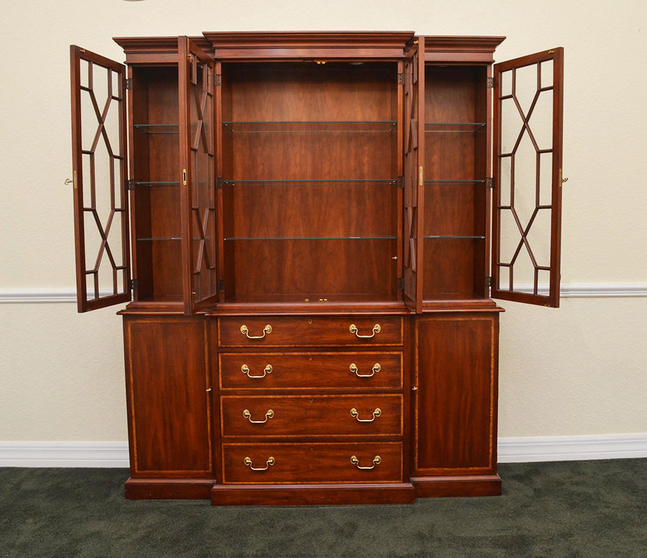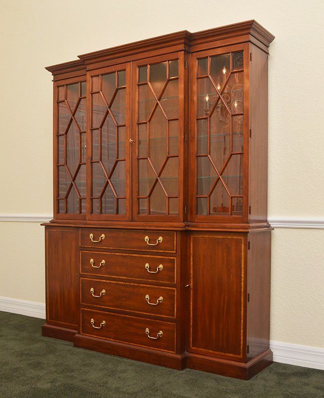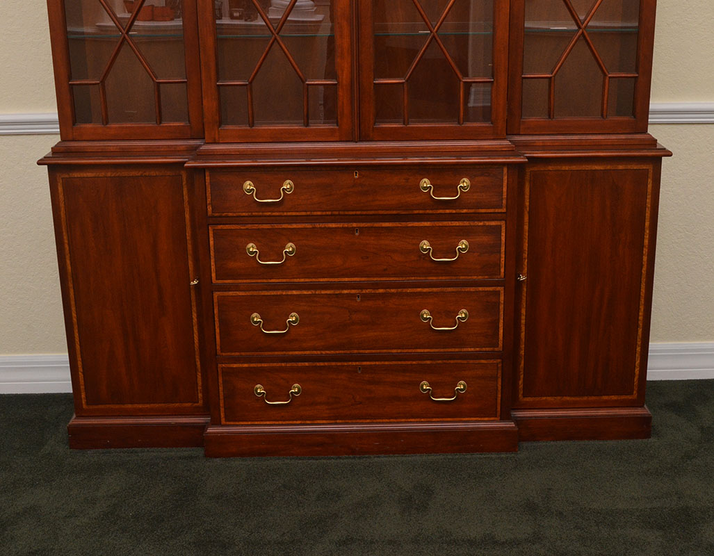 HENKEL HARRIS BLACK CHERRY BREAKFRONT CHINA CABINET: Illuminated top section with 4 fretwork doors, interior shelves. Base with 4 central drawers, top drawer fitted and lined silverware drawer. Flanked by single door either side. Overall measures 79 3/4'' h. x 65 1/4'' x 17 1/4''.