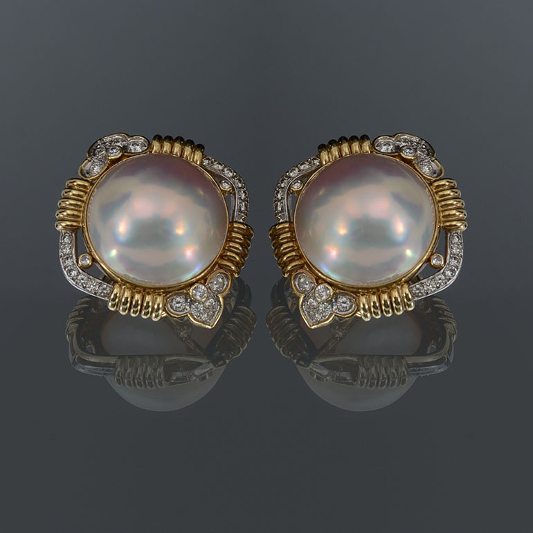 LUSTROUS 14K MABE PEARL & DIAMOND EARRINGS: 14K yellow gold earrings contain two 21.00 mm round cultured mabe pearls. White color with high luster. 56 round brilliant cut diamonds. WEIGHT: 1.40 Ct. Approx. Rated VS in clarity and G-H in color. The pearls are epoxy set. The diamonds are prong and bezel set. Post and hinged clip closures. Weight: 32.5 grams.