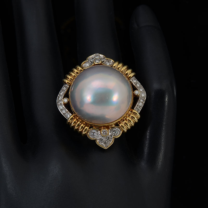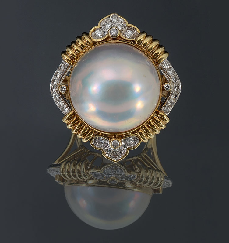 14K MABE PEARL & DIAMOND RING: 14K yellow gold ring contains one 21.00 mm round cultured mabe pearl. White color with high luster. 28 round brilliant cut diamonds. WEIGHT: .70 Ct. Approx. Rated VS in clarity and G-H in color. The pearl is epoxy set. The diamonds are prong and bezel set. Weight: 18.3 grams. Size: 6.5