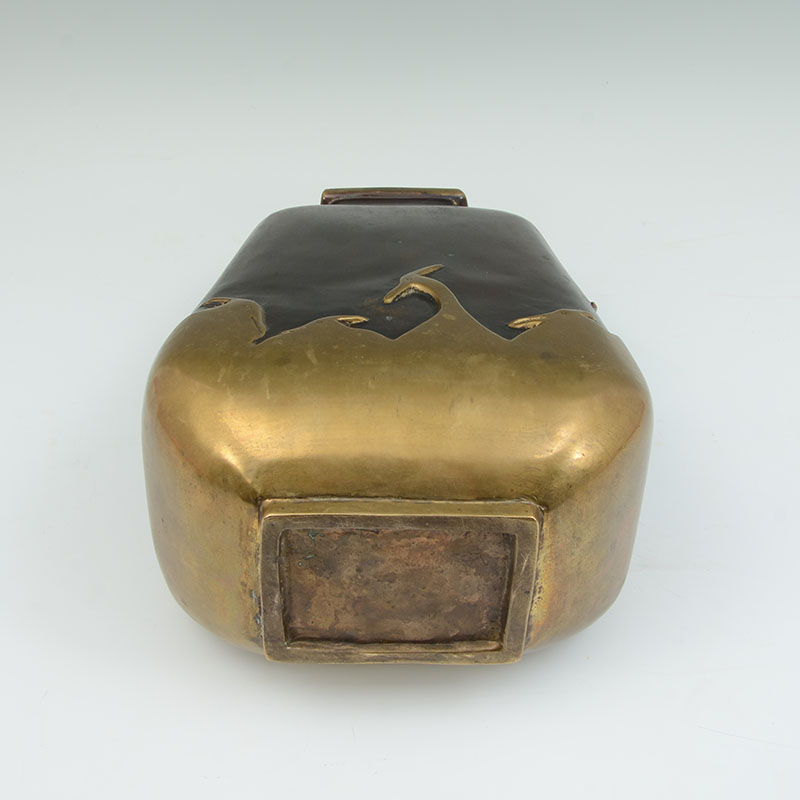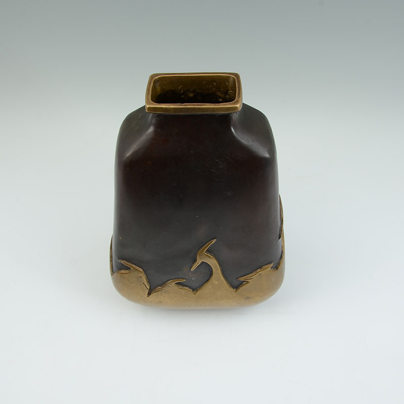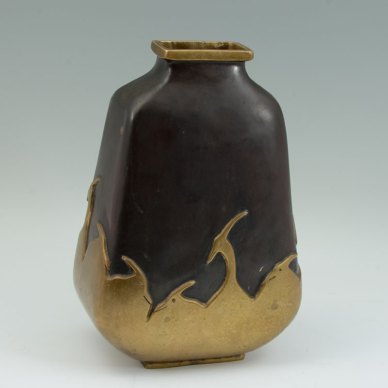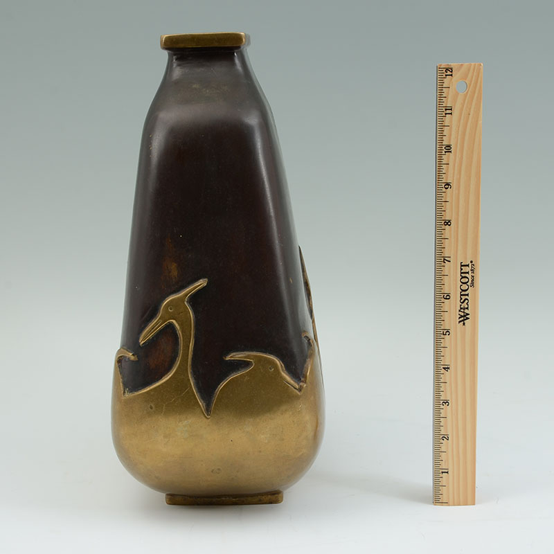 UNUSUAL PTERODACTYL MOTIF BRONZE VASE: Tapered rectangular body with a most unusual raised stylized pterodactyl dinosaur border on lower half. No visible signature, 13'' h. x 9'' x 5 1/2''.