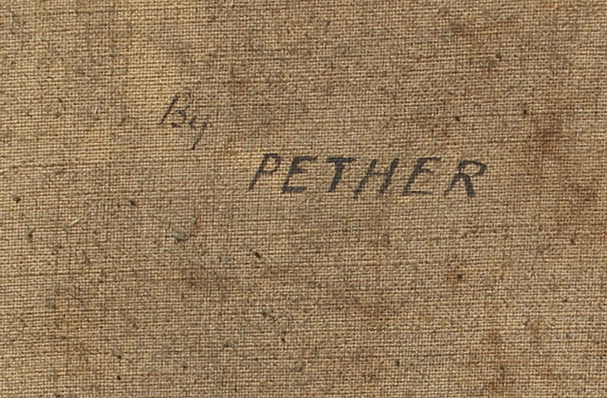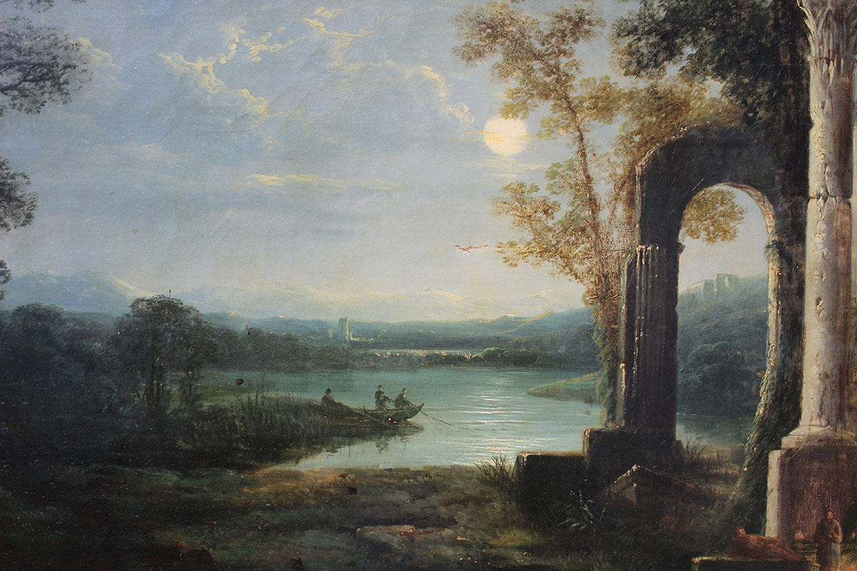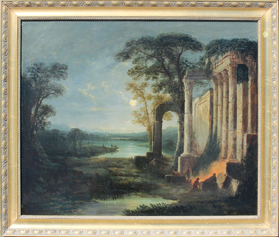 PETHER, Sebastian, (English, 1790-1844): Nocturnal Moonlit Landscape with Ruins, Travelers in a Boat and Mountains in the Distance, Oil on Canvas, signed ''Pether'' verso, no visible signature on the front, 24.75'' x 30'', contemporary frame 29.5'' x 34.5''.