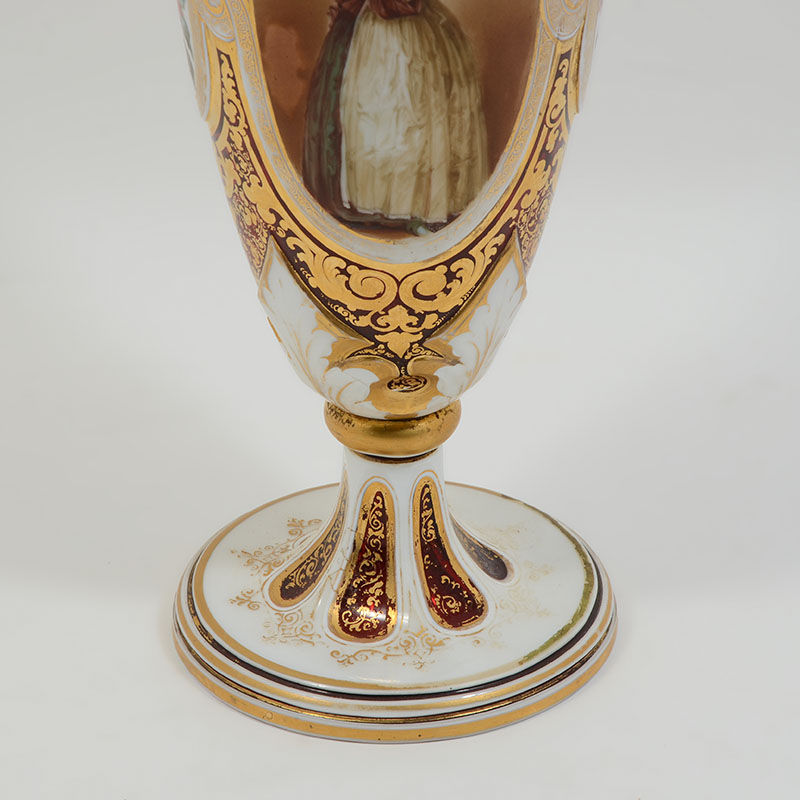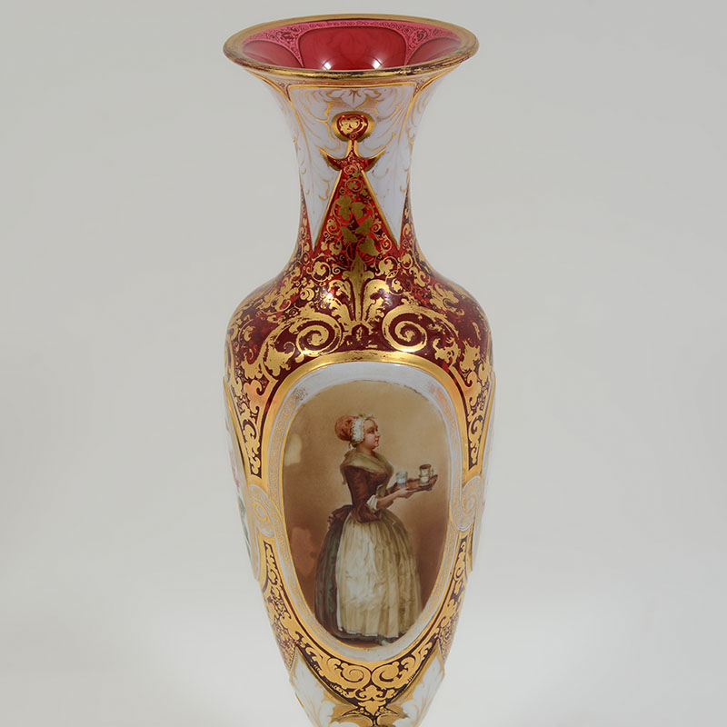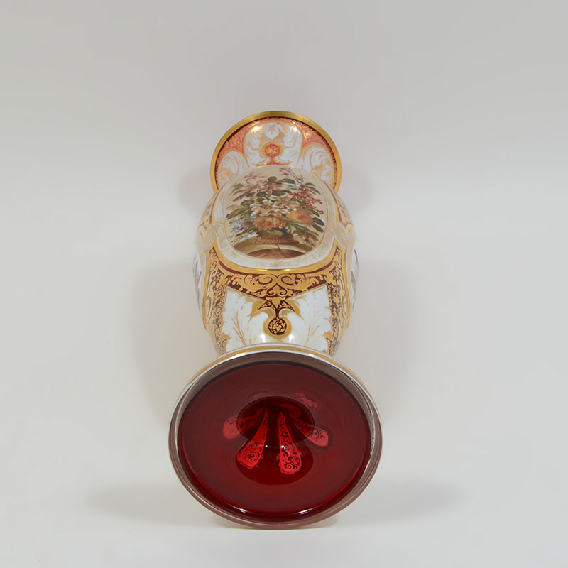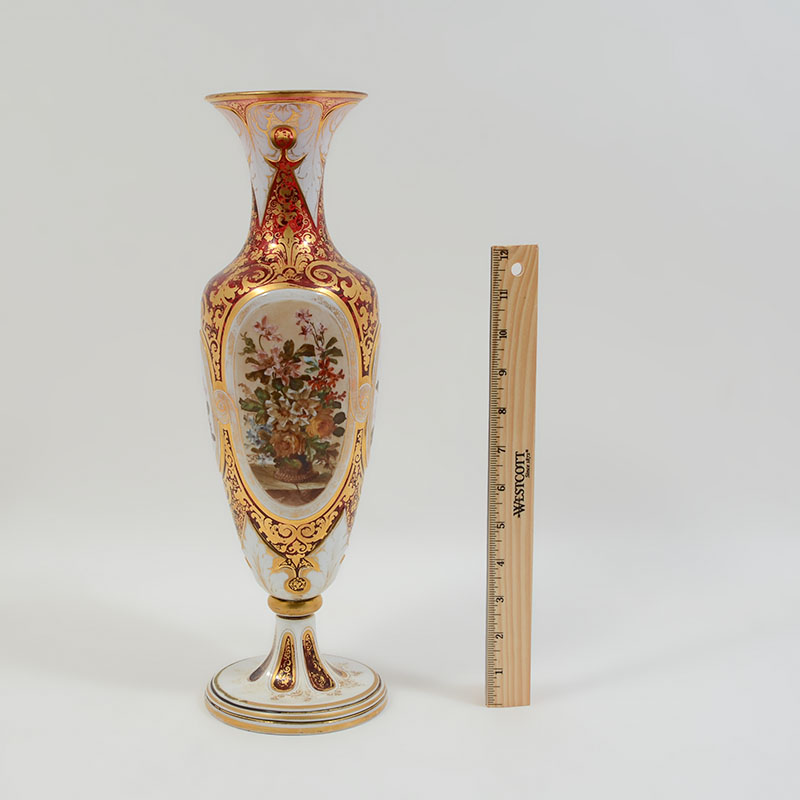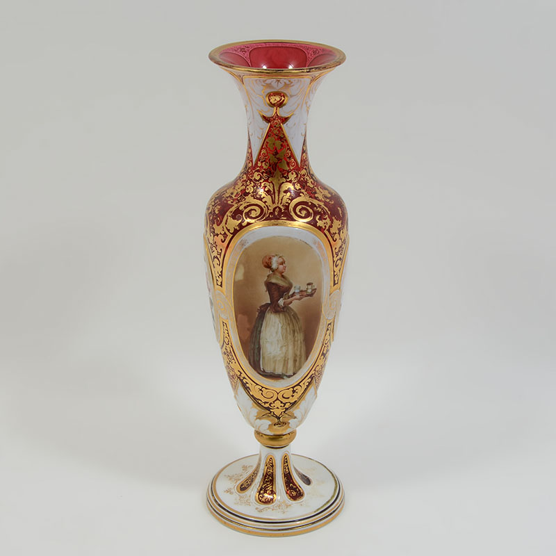 BOHEMIAN CRANBERRY GLASS PORTRAIT VASE: Flared rim, cranberry glass body with white accent panels. Center ring of panel with portrait of a servant and 3 floral motif medallions, white over cranberry foot. Gilt arabesque floral decoration all over, measures 16'' h. x 4 3/4''.