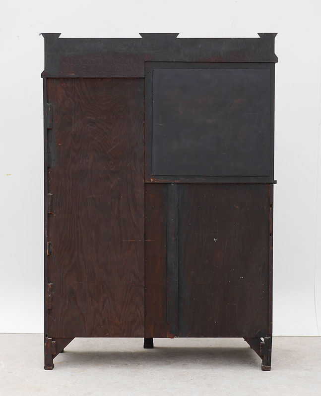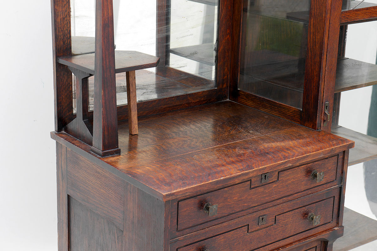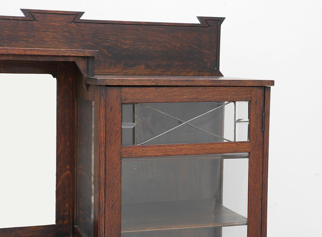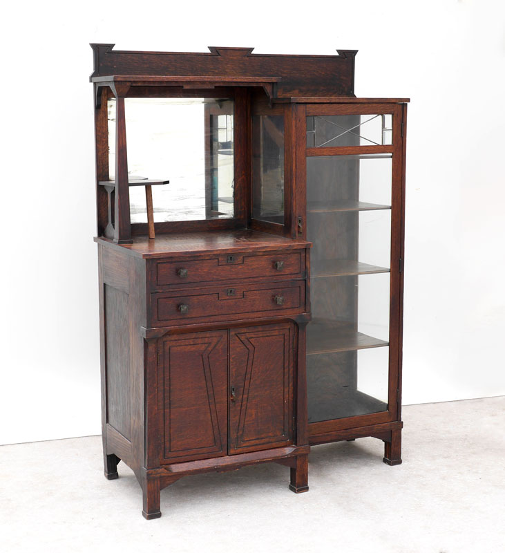 ARTS & CRAFTS OAK SIDE BY SIDE CABINET: Shaped crest with over shelf. Glass door right side with leaded glass top panel, 4 interior wood shelves. Left side with mirrored backsplash, small raised shelf, 2 drawers over 2 doors, hammered copper hardware. Measures 67 1/4'' h. x 46 1/4'' x 21 1/4''.