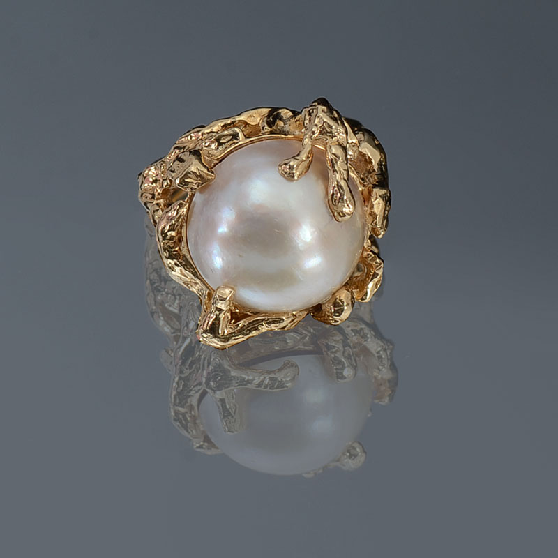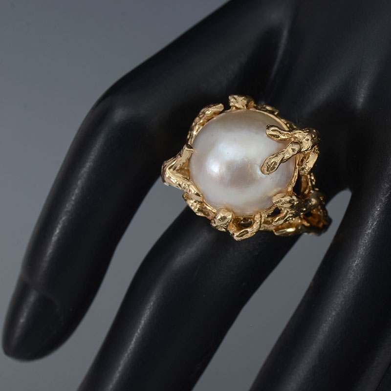 14K GOLD AND MABE PEARL RING: 14K yellow gold ring contains one 15.00 mm round cultured mabe pearl. Cream color with low luster. The ring has a coral branch motif. The pearl is epoxy set. Weight: 12.3 grams. Size: 5.5