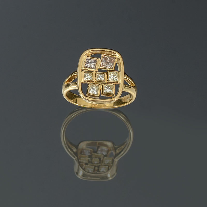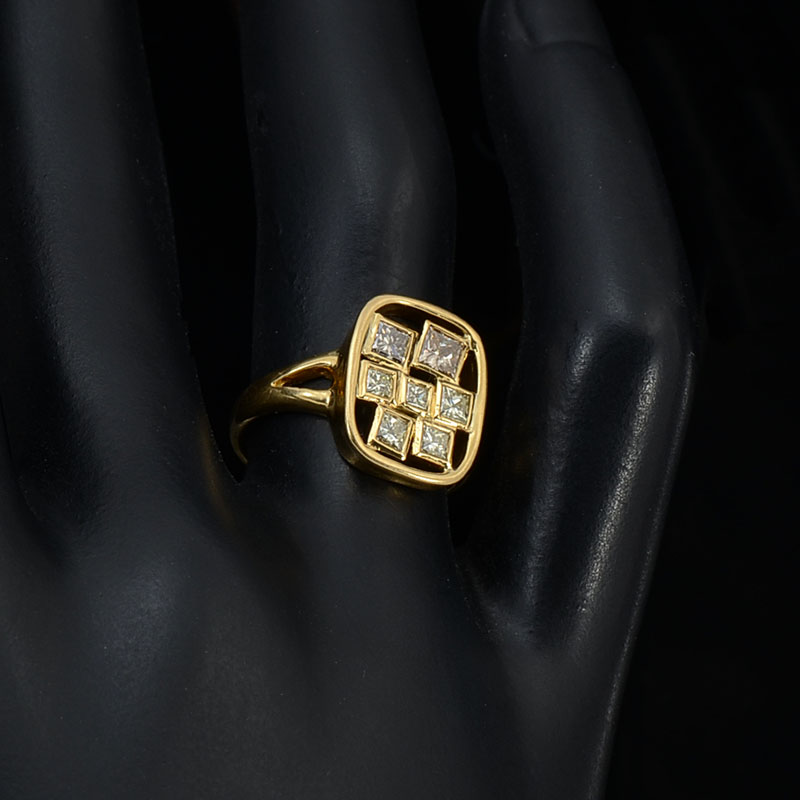 18K & DIAMOND ABSTRACT 80'S DESIGNER RING: 6 square brilliant cut diamonds are bezel set in a contemporary arrangement. Diamonds are rated VS in clarity and range in color, light yellow-pinkish-brown. Total weight 4.4 grams. Size 6. Sold with current Atlanta Gemological GIA graduate's appraisal for $2250.