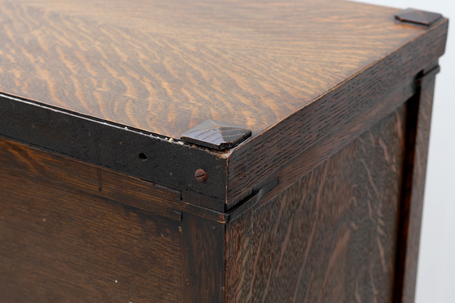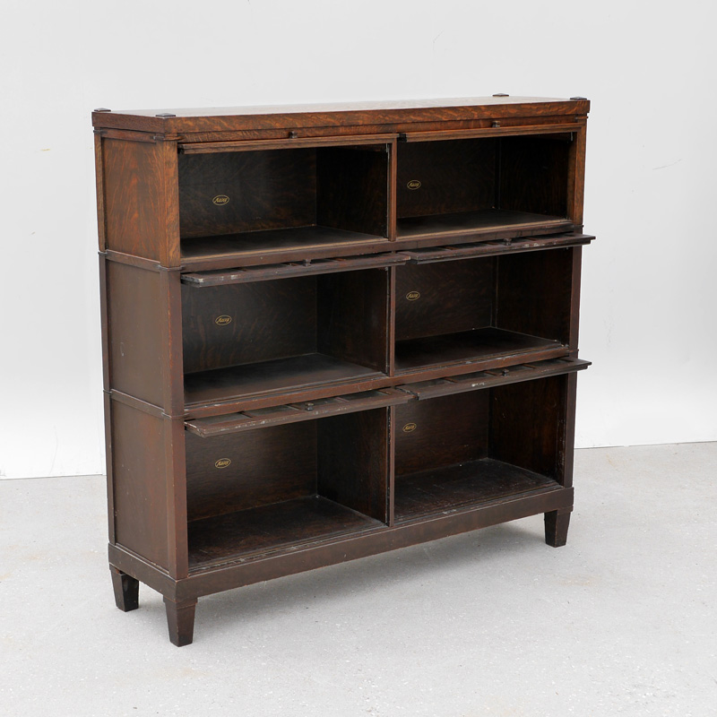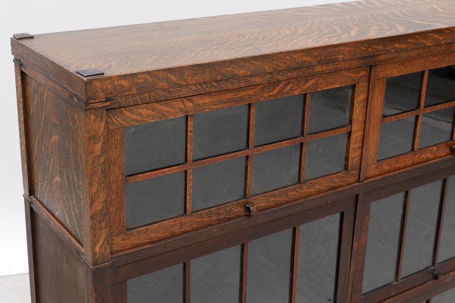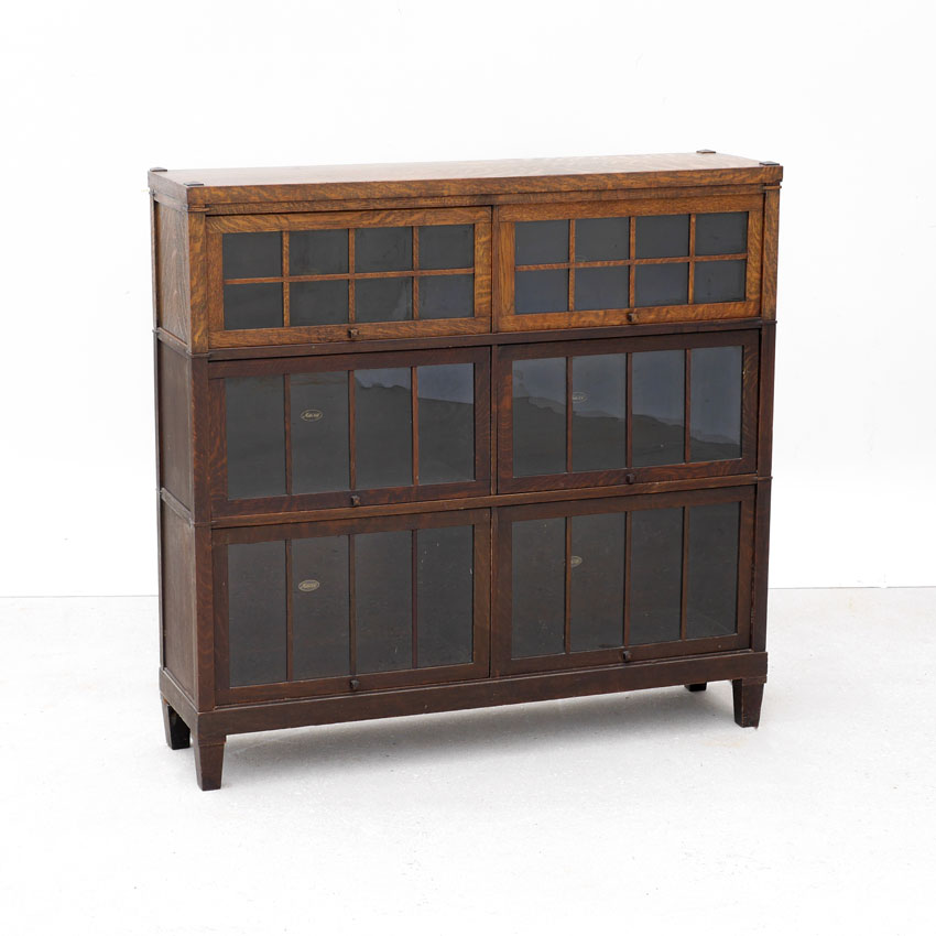 MACEY ARTS & CRAFTS 3 DOUBLE STACK BOOKCASE: 3 stack lawyers or barristers bookcase, each stack with double glass doors, marked Macey inside, on 4 legs. Overall measures 46 1/2'' h. x 48'' x 13''.