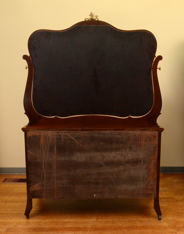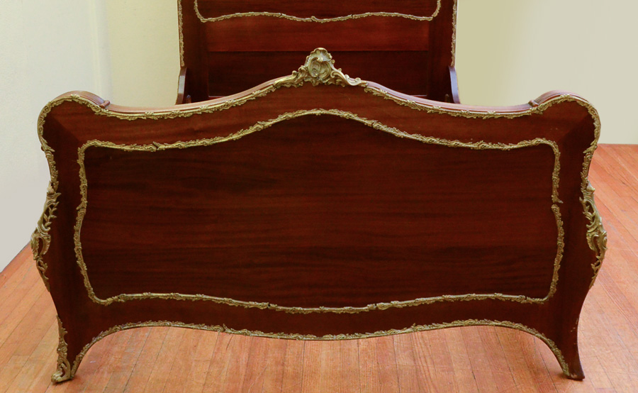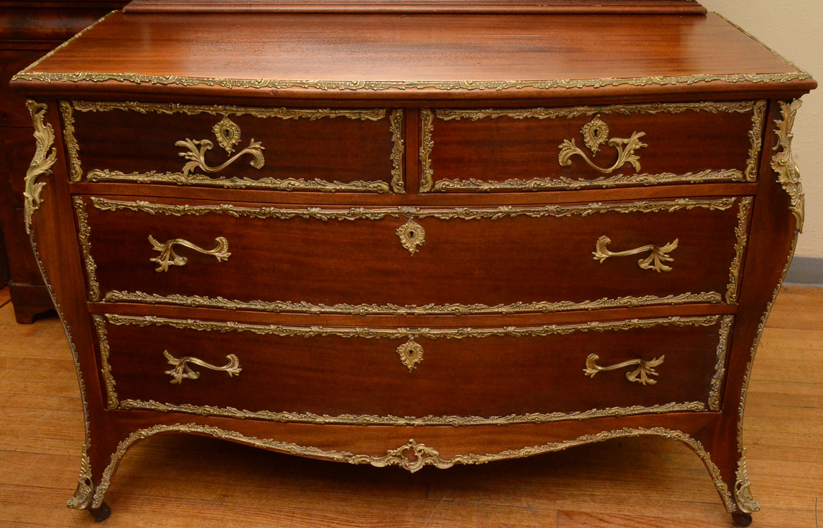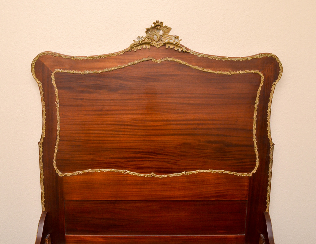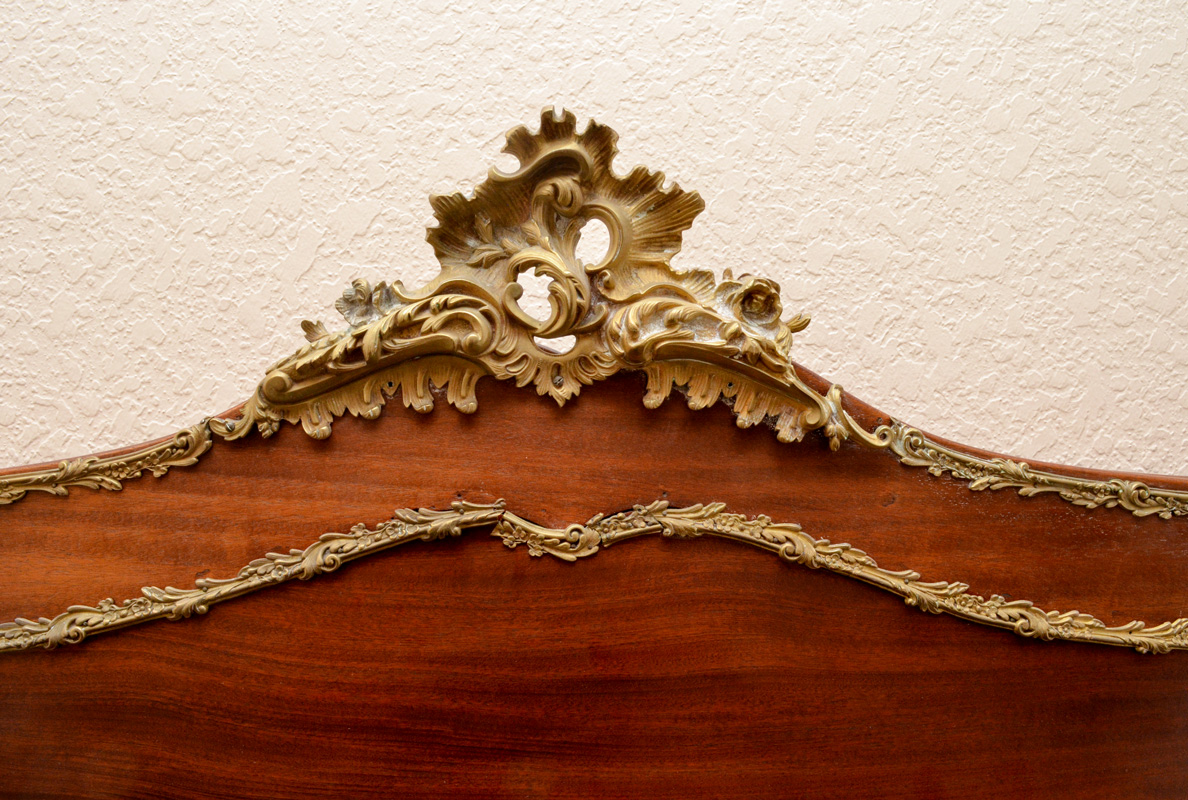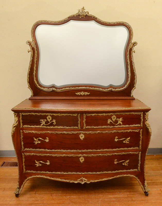 FRENCH MAHOGANY GILT METAL MOUNTED BEDROOM SUITE: 8 piece bedroom suite with rococo style foliate accents on each piece to include 1) Bed, headboard measures 69'' h. x 59 1/2'' x 3 3/4''; foot board 39 1/4''; rails 76 1/4''. 2) Tall chest with slight bowfront, shaped beveled glass mirror, 2 half drawers over 4 full drawers, 77 1/2'' h. x 38 3/4'' x 21''. 3) Dresser with sight bowfront, shaped beveled glass mirror, 2 half drawers over 2 full drawers, 77'' h. x 53 14'' x 23''. 4) Vanity with slight bowfront, large shaped beveled glass mirror, 2 drawers over 2 drawer either side of kneehole, 65'' h. x 41 3/4'' x 21''. 5) Chair with floral pattern upholstery, 37 3/4'' h. x 19 1/2'' x 19 3/4''. Sold with 3 matching table with rococo foliate gilt metal accents, taller table 29 3/4'' h. x 28 1/4'' x 22''. The 2 smaller tables 15 3/4'' h. x 16 1/4'' x 16 1/4''.
