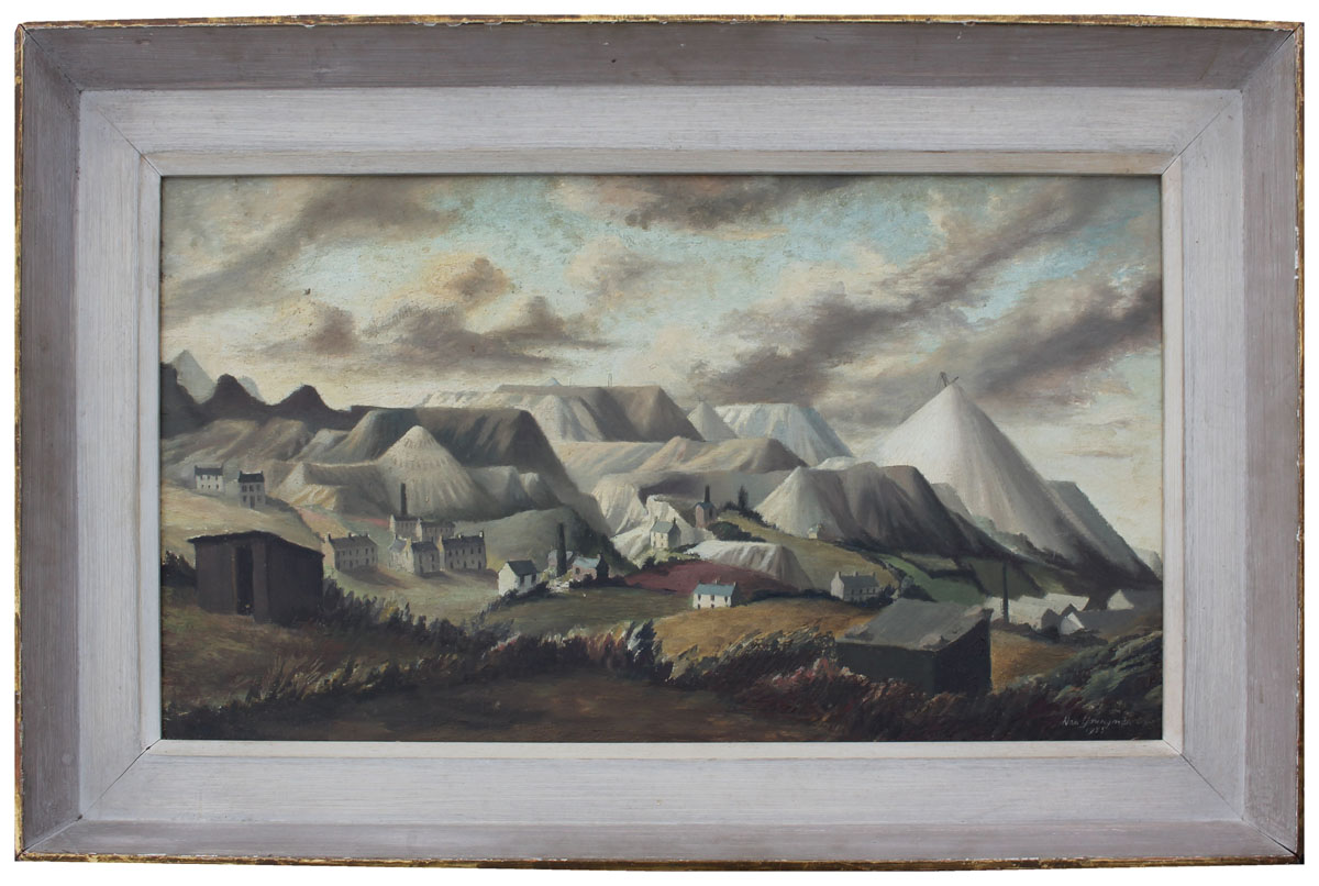 YOUNGMAN, Nan, (English 1906-1995): Panoramic View of a Village with Mine in the Distance, Oil on Wood, signed lower right, dated 1935, 14'' x 26'', painted frame 20.5'' x 32'' x 2.5''.