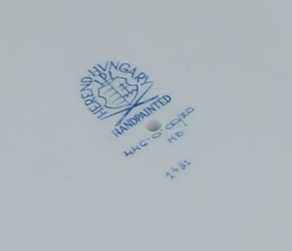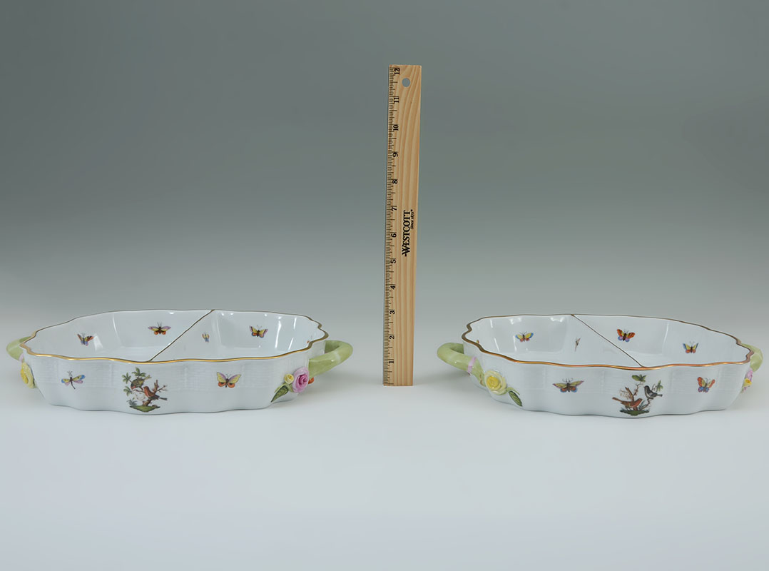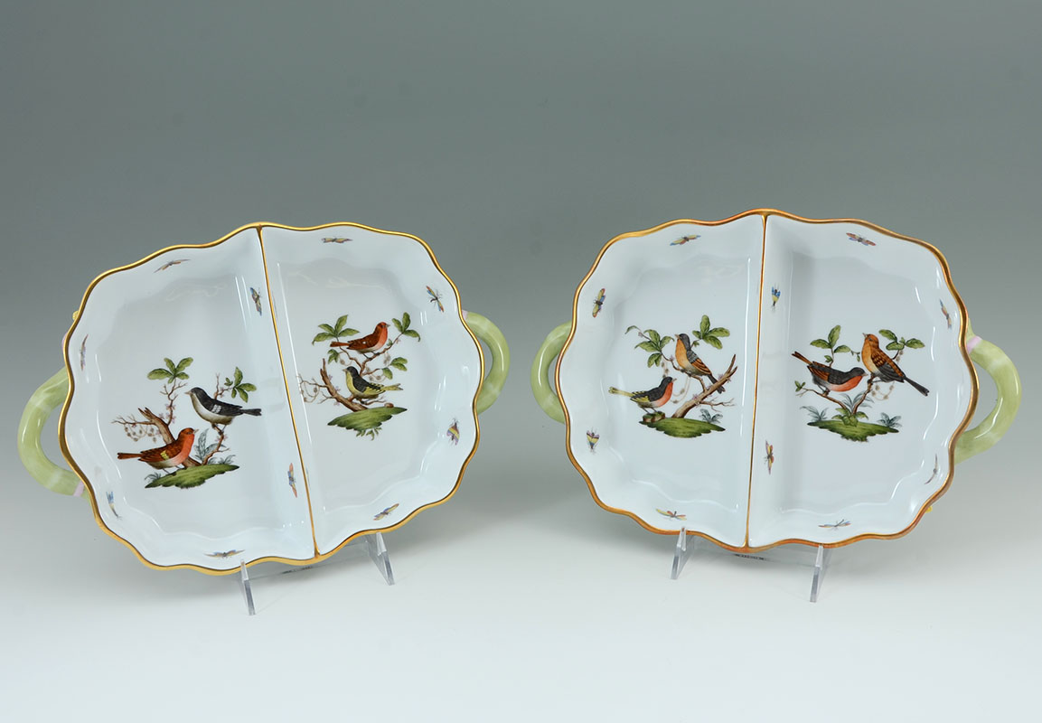 PAIR HEREND ROTHSCHILD BIRD 2 SECTION HOR D'OEUVRES: Pair of 2 section hor d'oeuvre handled serving dishes in the Rothschild Bird pattern by Herend, overall 2'' h. x 13 1/2'' x 9 1/4''.