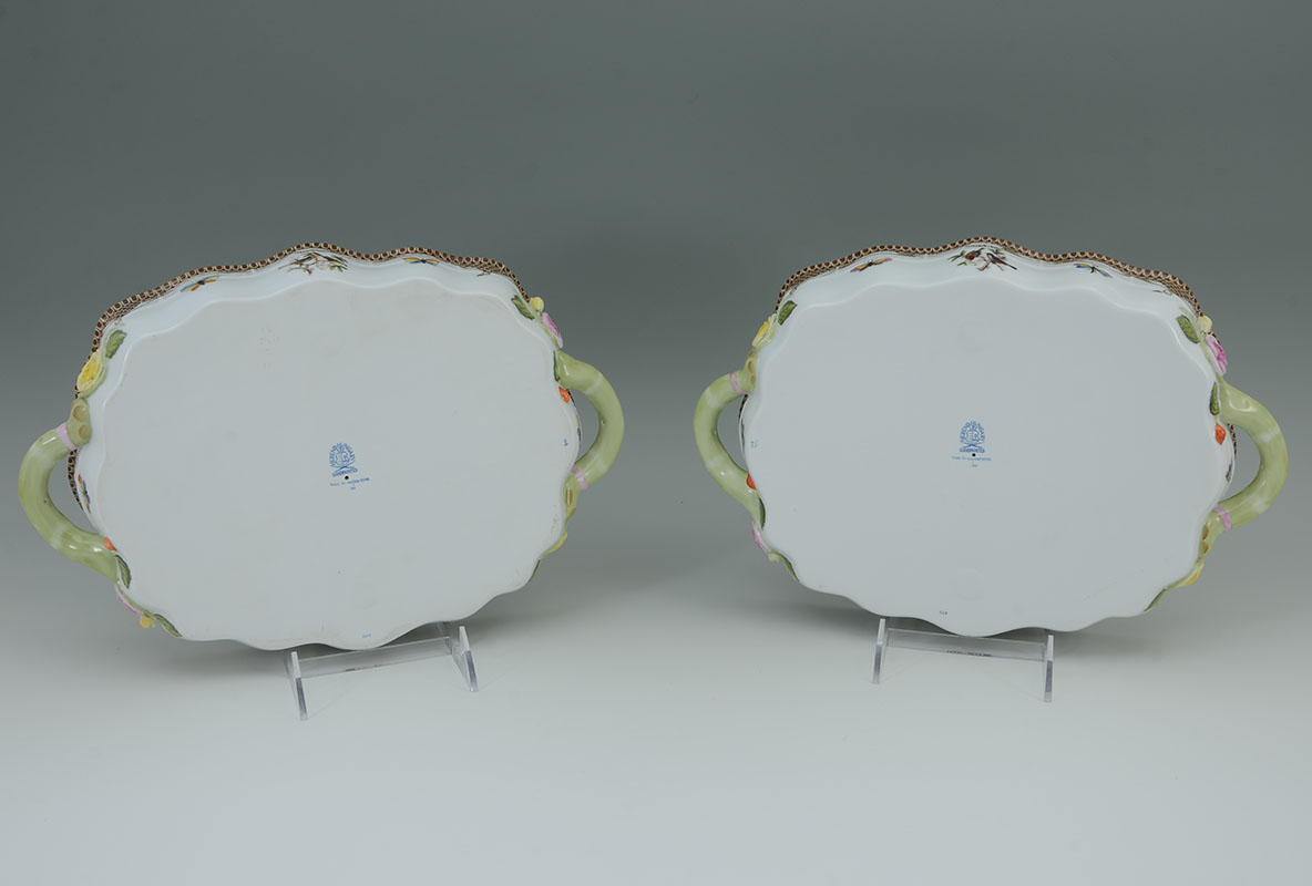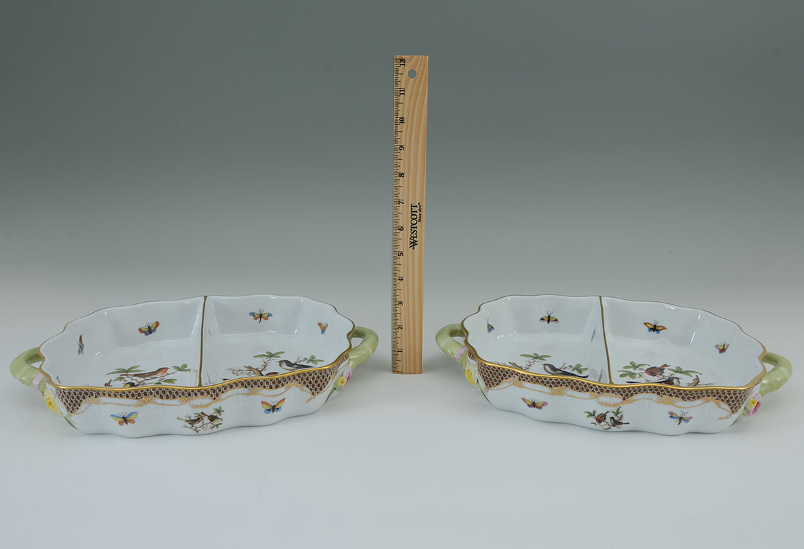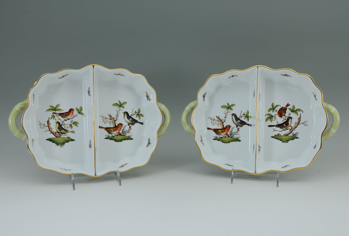 PAIR HEREND ROTHSCHILD BIRD BROWN 2 SECTION HOR D'OEUVRES: Pair of 2 section hor d'oeuvre handled serving dishes in the Rothschild Bird Brown pattern by Herend, overall 2'' h. x 13 1/2'' x 9 1/4''.