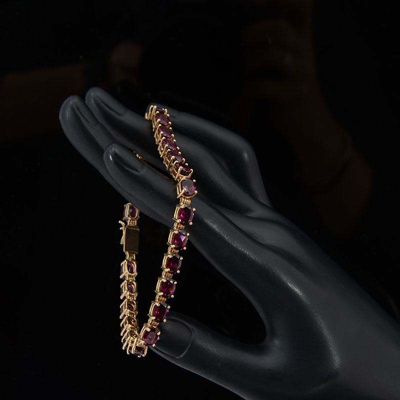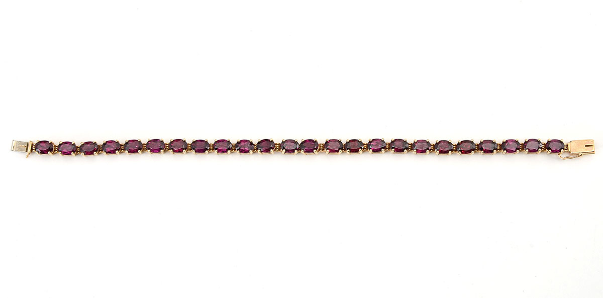 14K RHODOLITE GARNET IN-LINE BRACELET: 24 oval garnets are perfectly prong set in 14K yellow gold. Total weight 21 grams. 7-1/2'' in length.