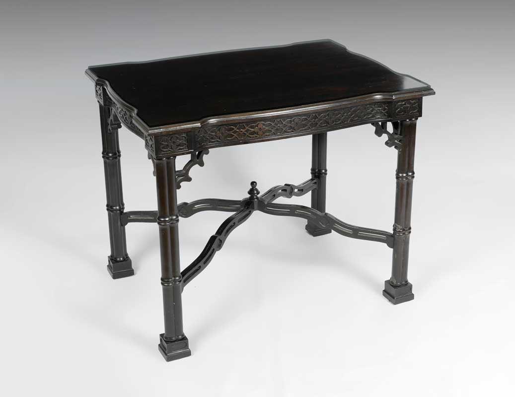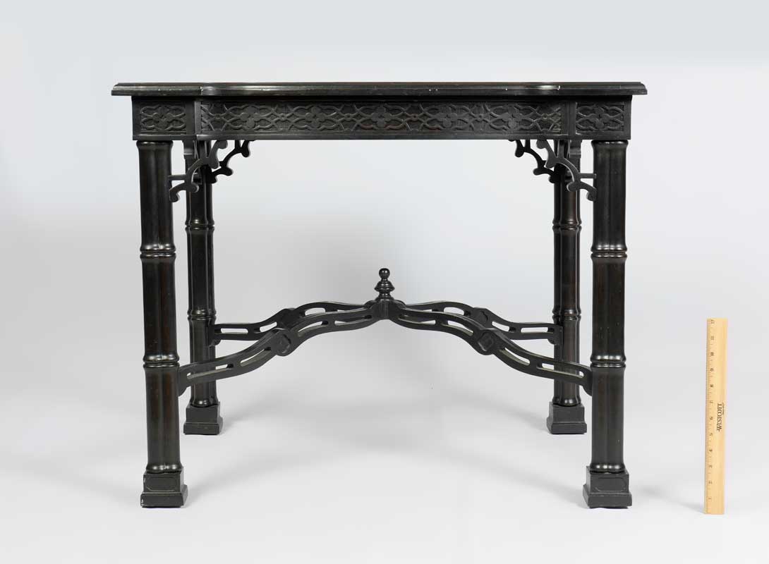 EBONIZED CARVED FAUX BAMBOO OCCASIONAL TABLE: Shaped top with fitted glass, skirt carved with floral motif panels, faux bamboo legs, pierced carved and shaped stretcher, turned center finial. Overall measures 26 3/4'' h. x 32'' x 25''.