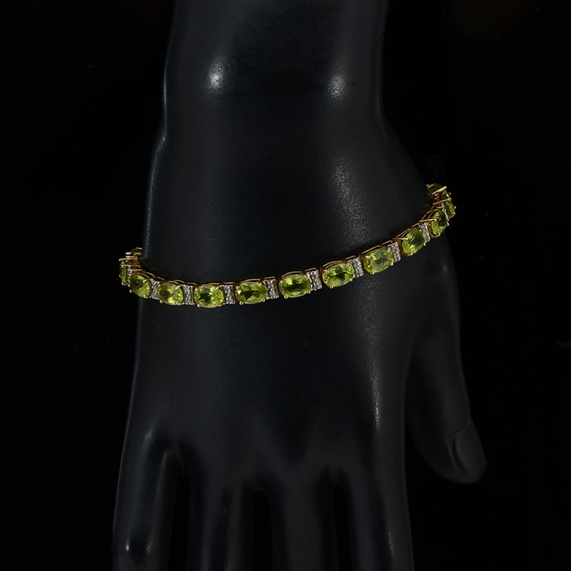 14K PERIDOT BRACELET: 20 lovely oval cut peridot stones are offset by 40 small prong set diamonds. Length 7-1/2''. Total weight 11 grams.
