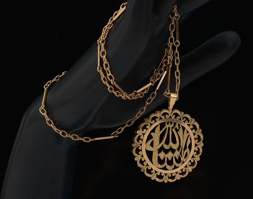 18K MEDALLION & CHAIN: 18K yellow gold cut-out medallion. 18K yellow gold fetter and 10'' chain. Spring ring clasp. Medallion: 1.5'' diameter. Chain: 32'' Weight: 23.3 grams.