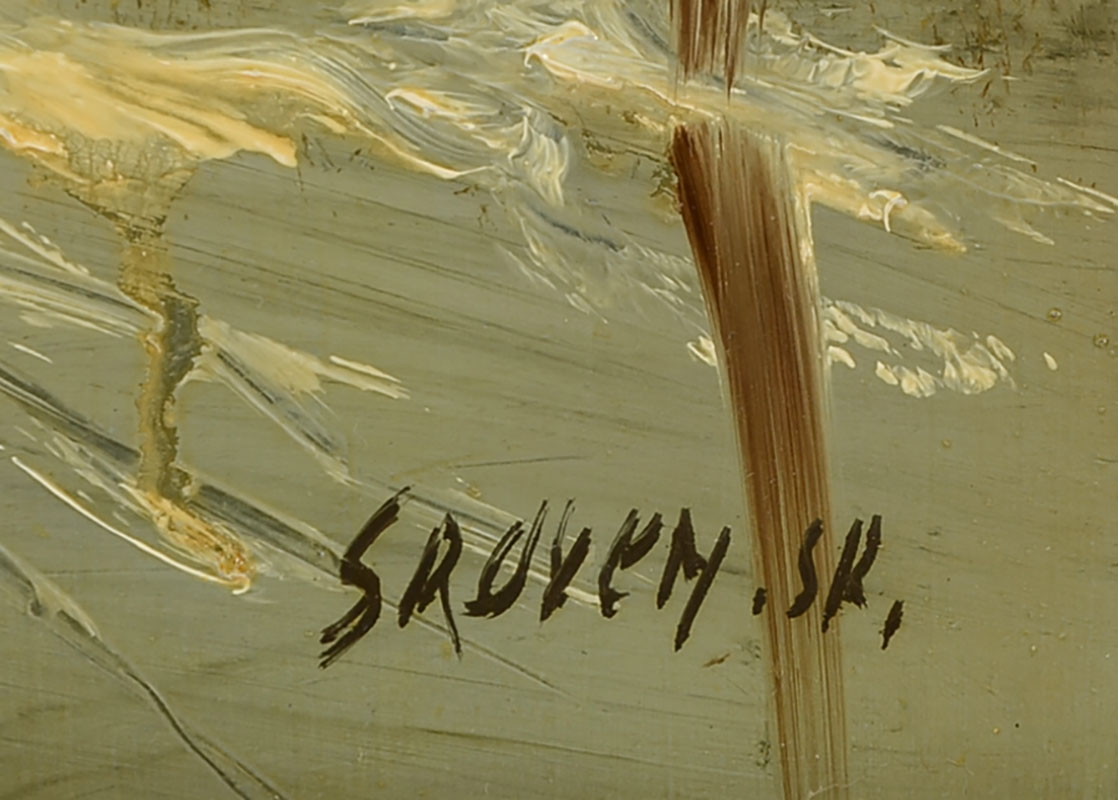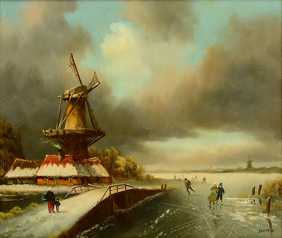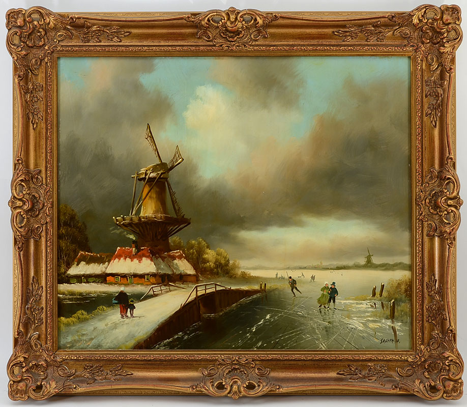 GROVEN, Rolf Dagfinn, (Norwegian, 1943-): ''Wilsveen Close to the Hague, Holland'', Oil/Board, 19.5'' x 23.5'', signed lower right, pierce carved frame, 29'' x 25''. Groven is known for his figurative style and satirical art.