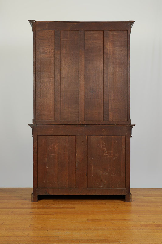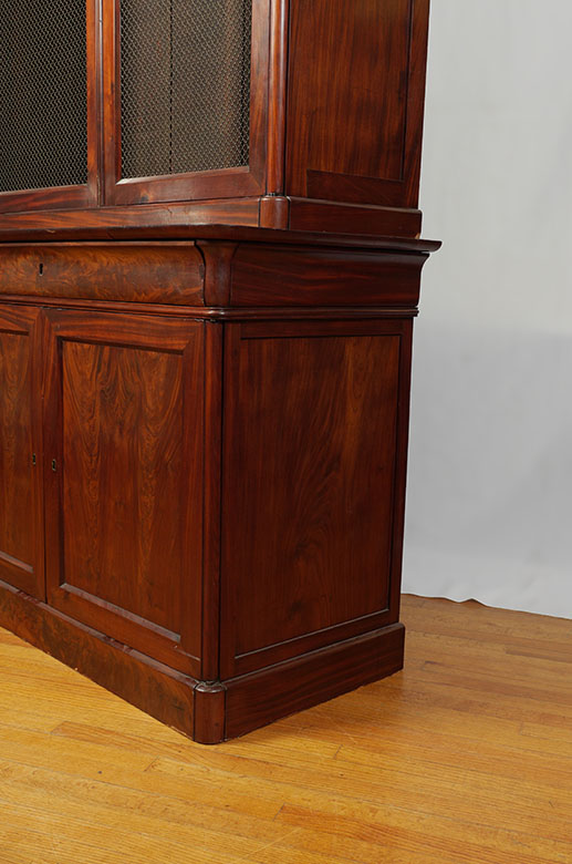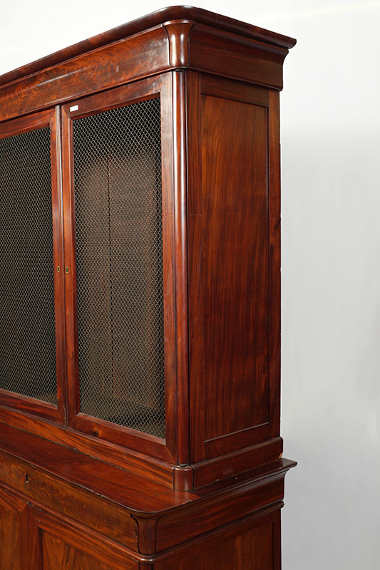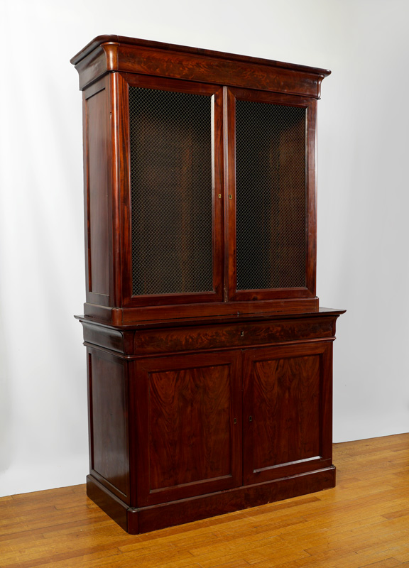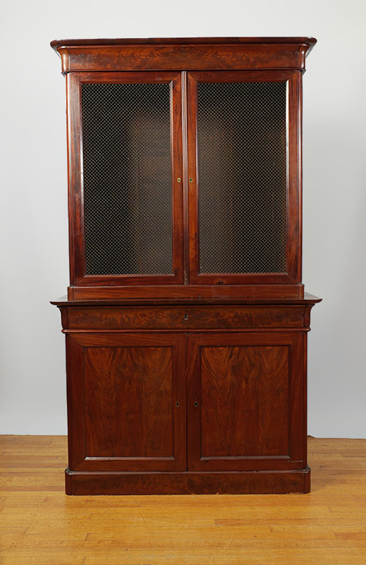 18TH CENTURY FRENCH MAHOGANY SECRETARY BOOKCASE: 2 door top with wire mesh front, wood shelves. Base with single drawer over 2 doors. Interior with 3 shelves over inset embossed leather slide out writing surface over 3 full length drawers. Overall measures 87 3/4'' h. x 51 1/2'' x 23 1/4''.